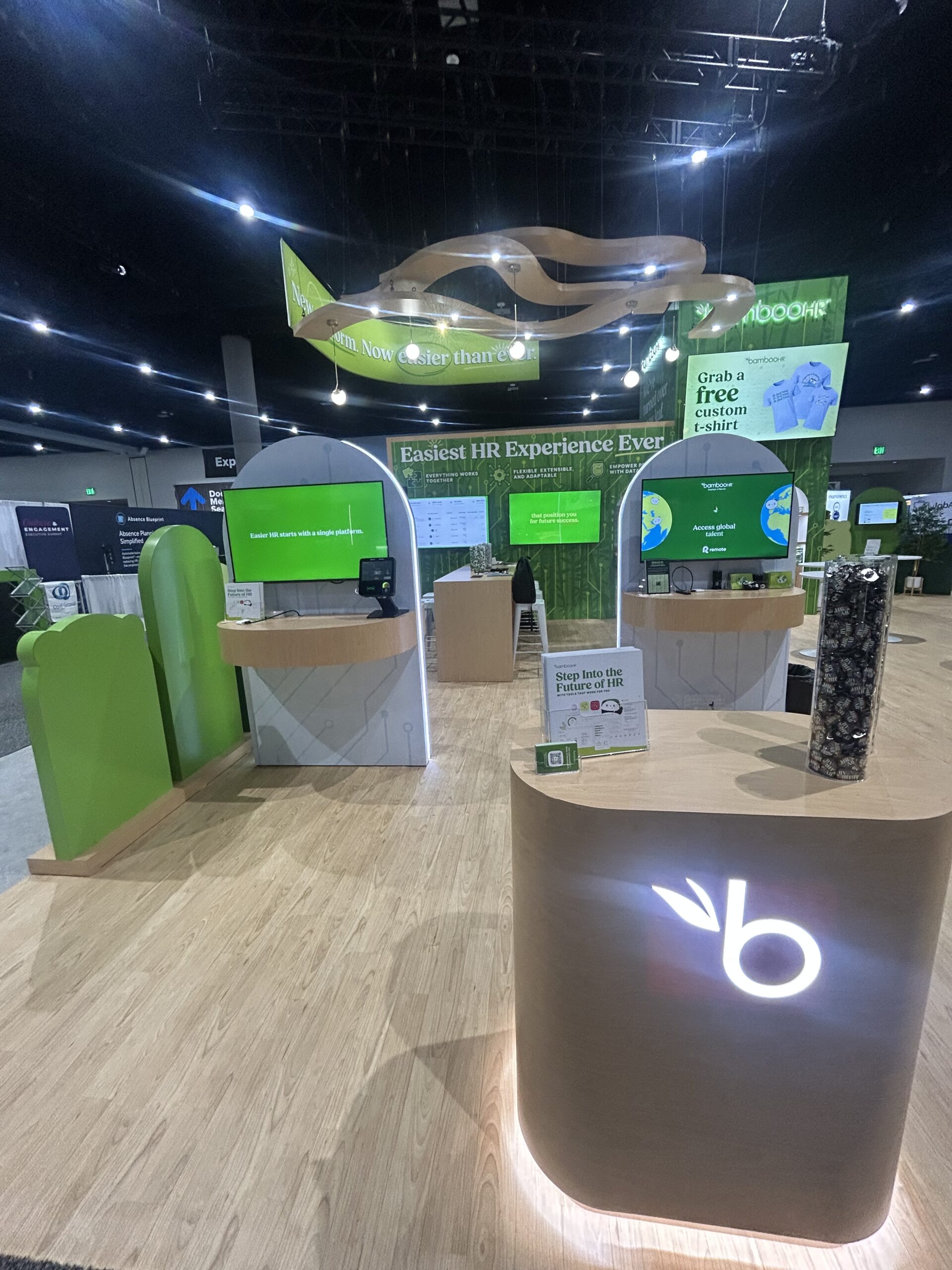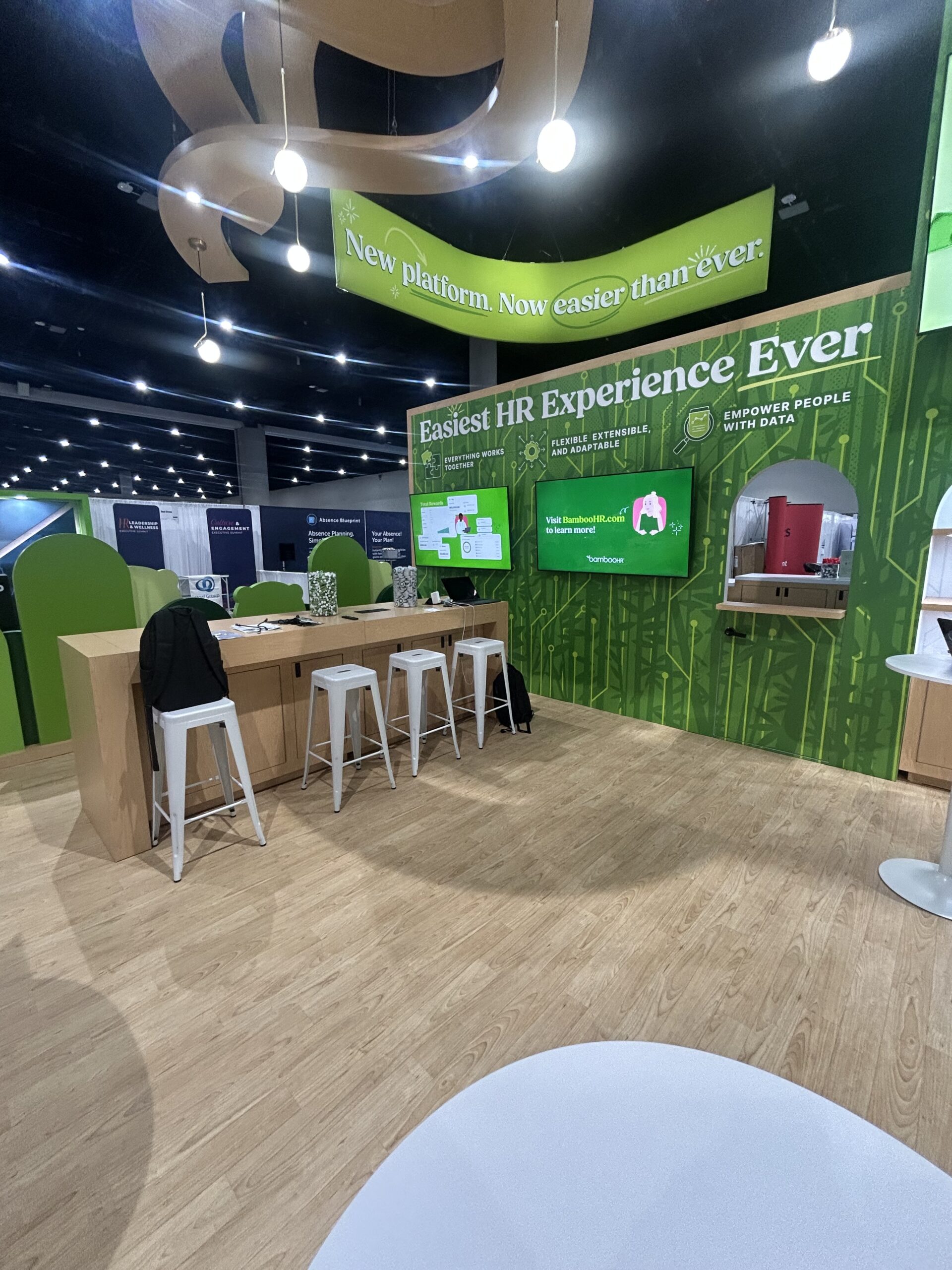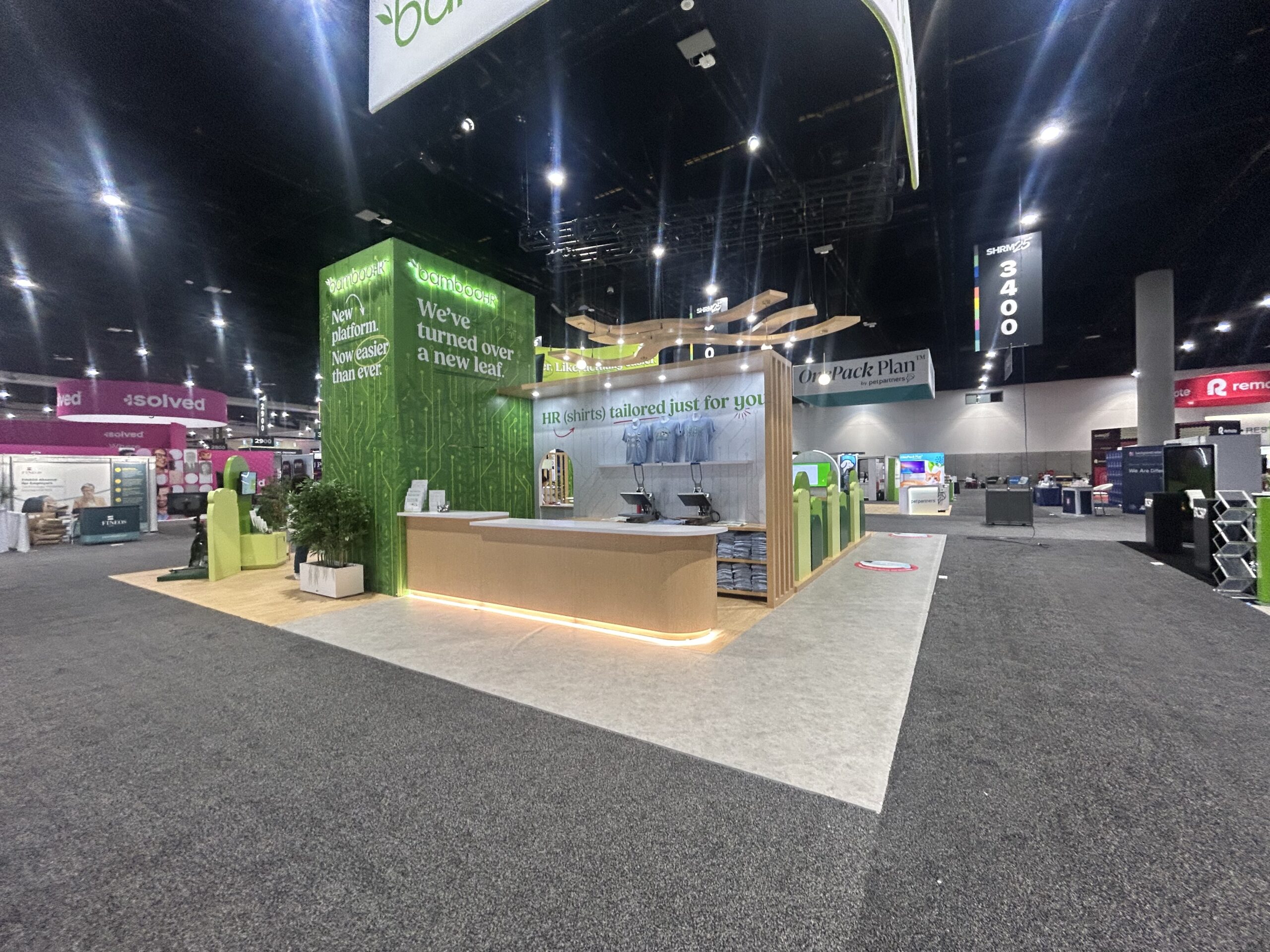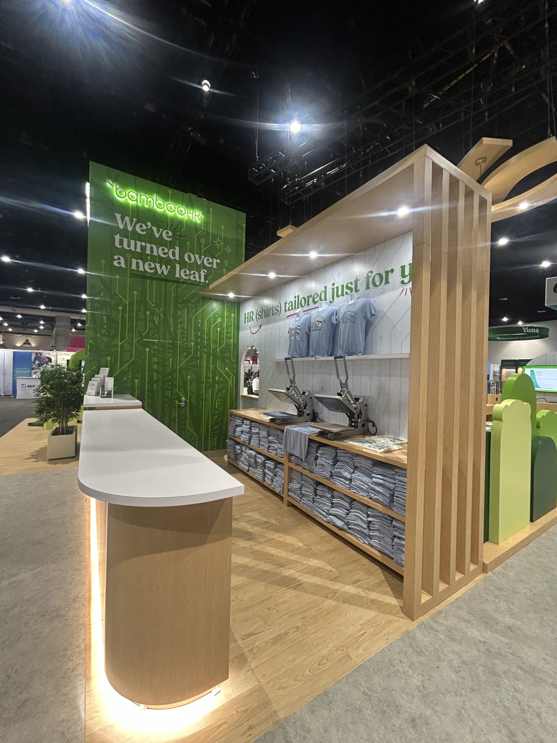 This large, custom-designed booth for BambooHR uses a “nature-meets-tech” aesthetic, leaning heavily into the brand’s signature lime green and wood-toned palette. It successfully balances organic elements (light oak wood floors, slatted wood walls, and potted plants) with modern technology (recessed LED lighting, sleek monitors, and clean typography). The use of floor decals (“This way for fresh-pressed shirts!”) helps with traffic flow and adds a playful touch to the professional setting.