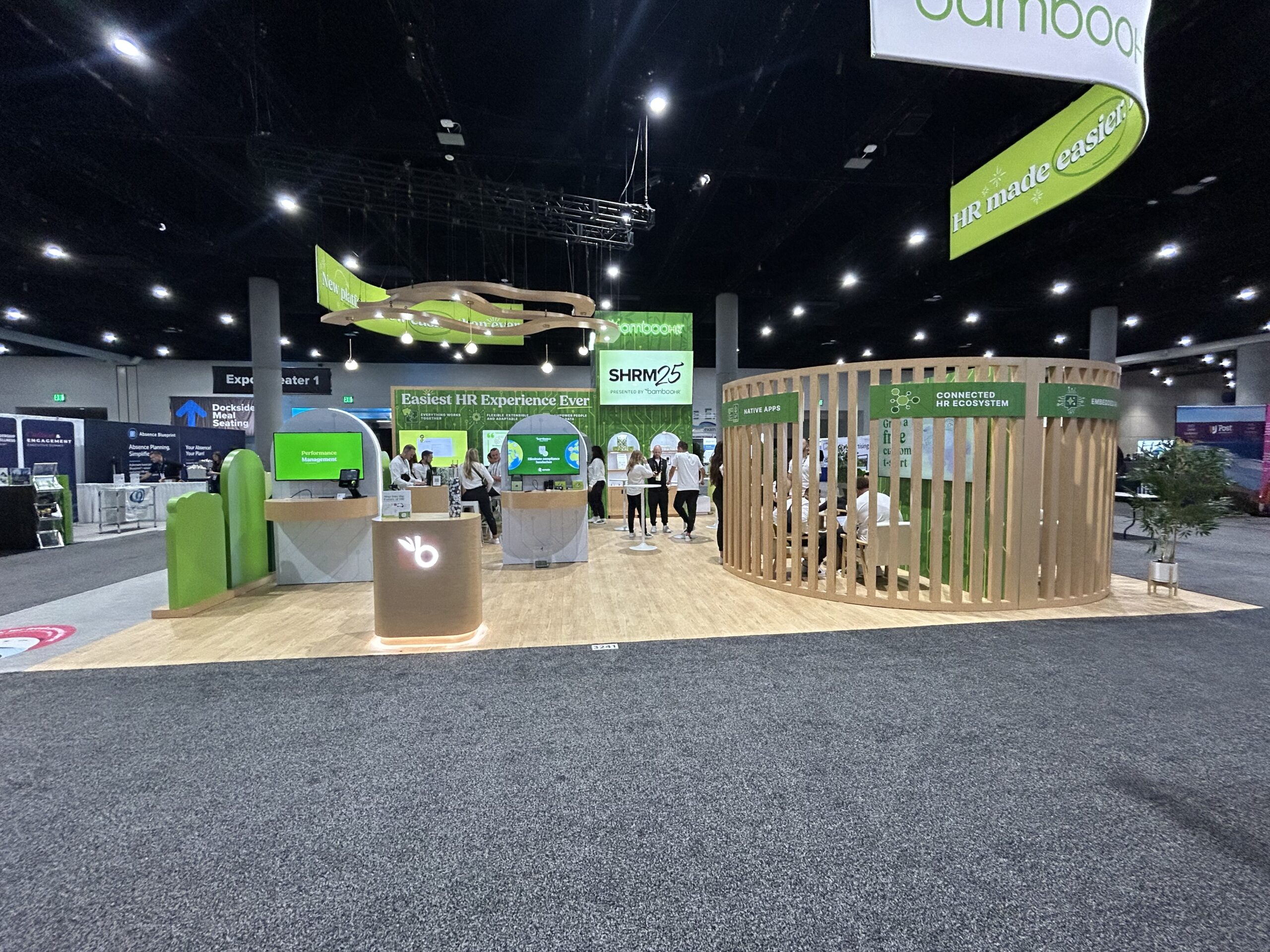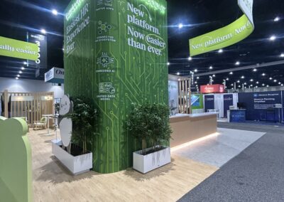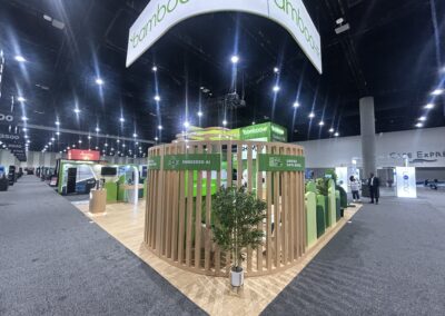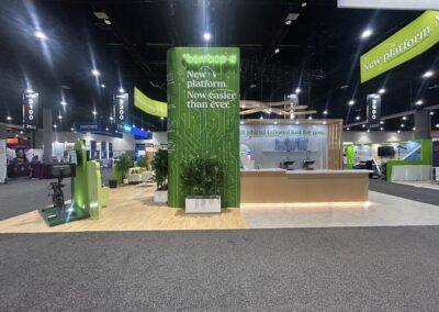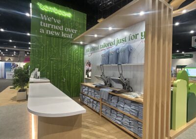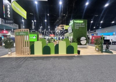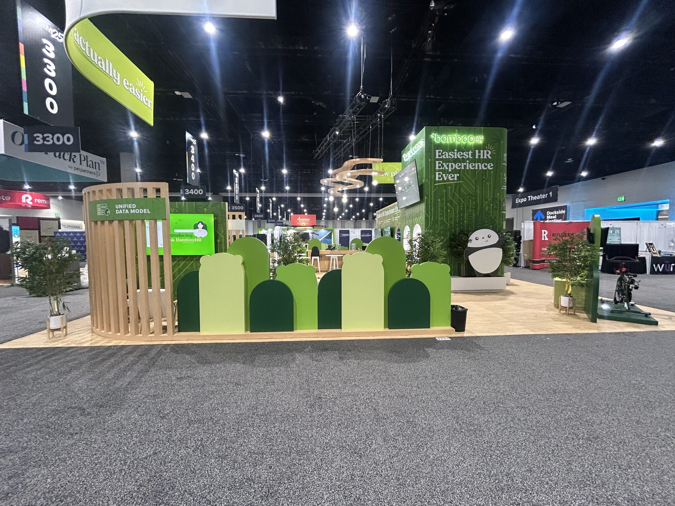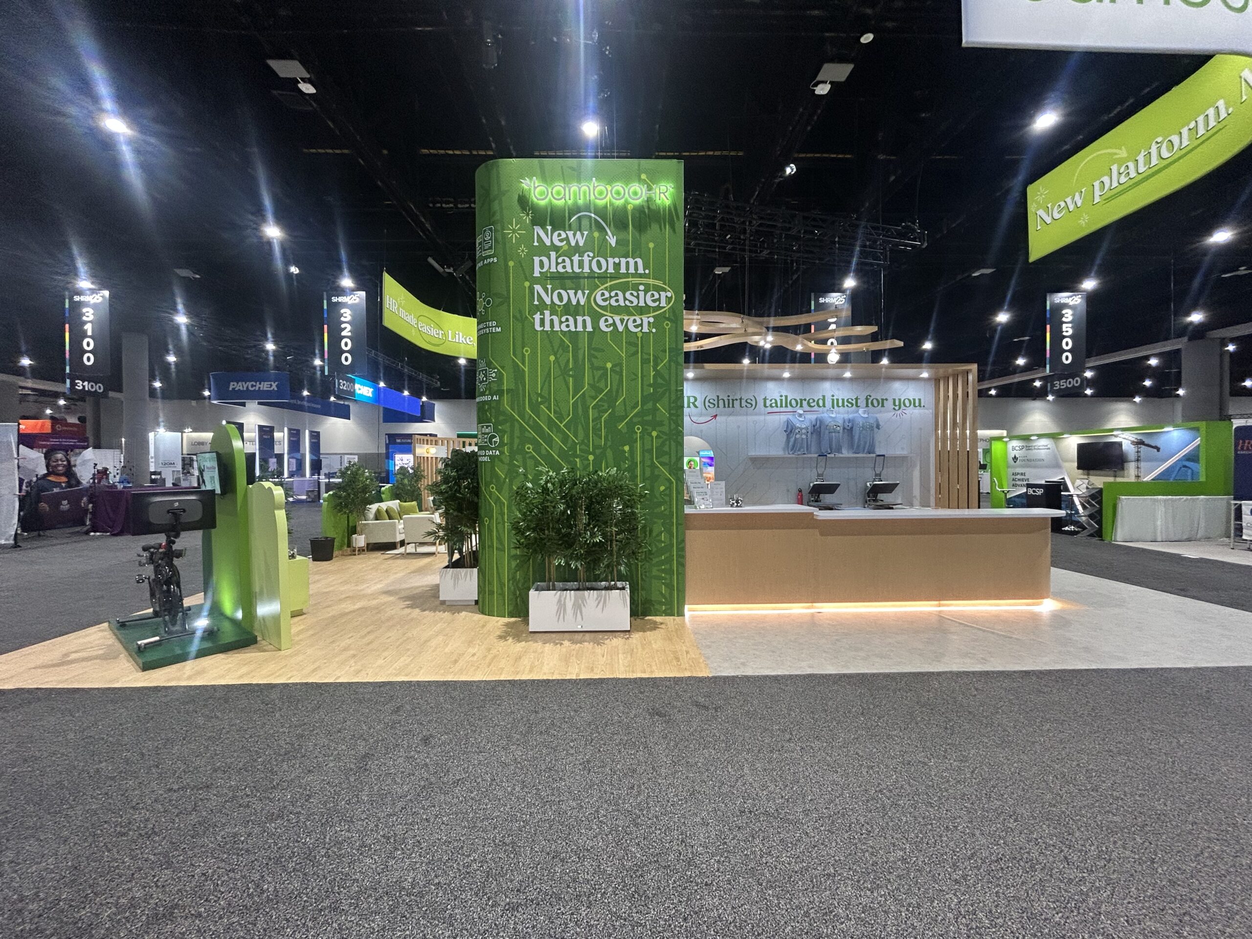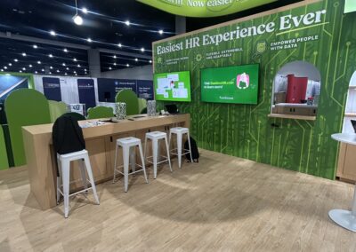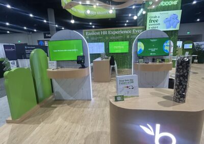 This large, custom-designed booth for BambooHR uses a “nature-meets-tech” aesthetic, leaning heavily into the brand’s signature lime green and wood-toned palette. It successfully balances organic elements (light oak wood floors, slatted wood walls, and potted plants) with modern technology (recessed LED lighting, sleek monitors, and clean typography). The use of floor decals (“This way for fresh-pressed shirts!”) helps with traffic flow and adds a playful touch to the professional setting.