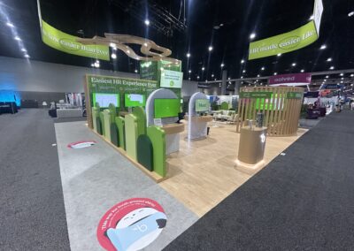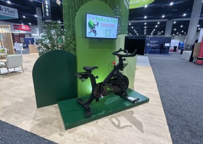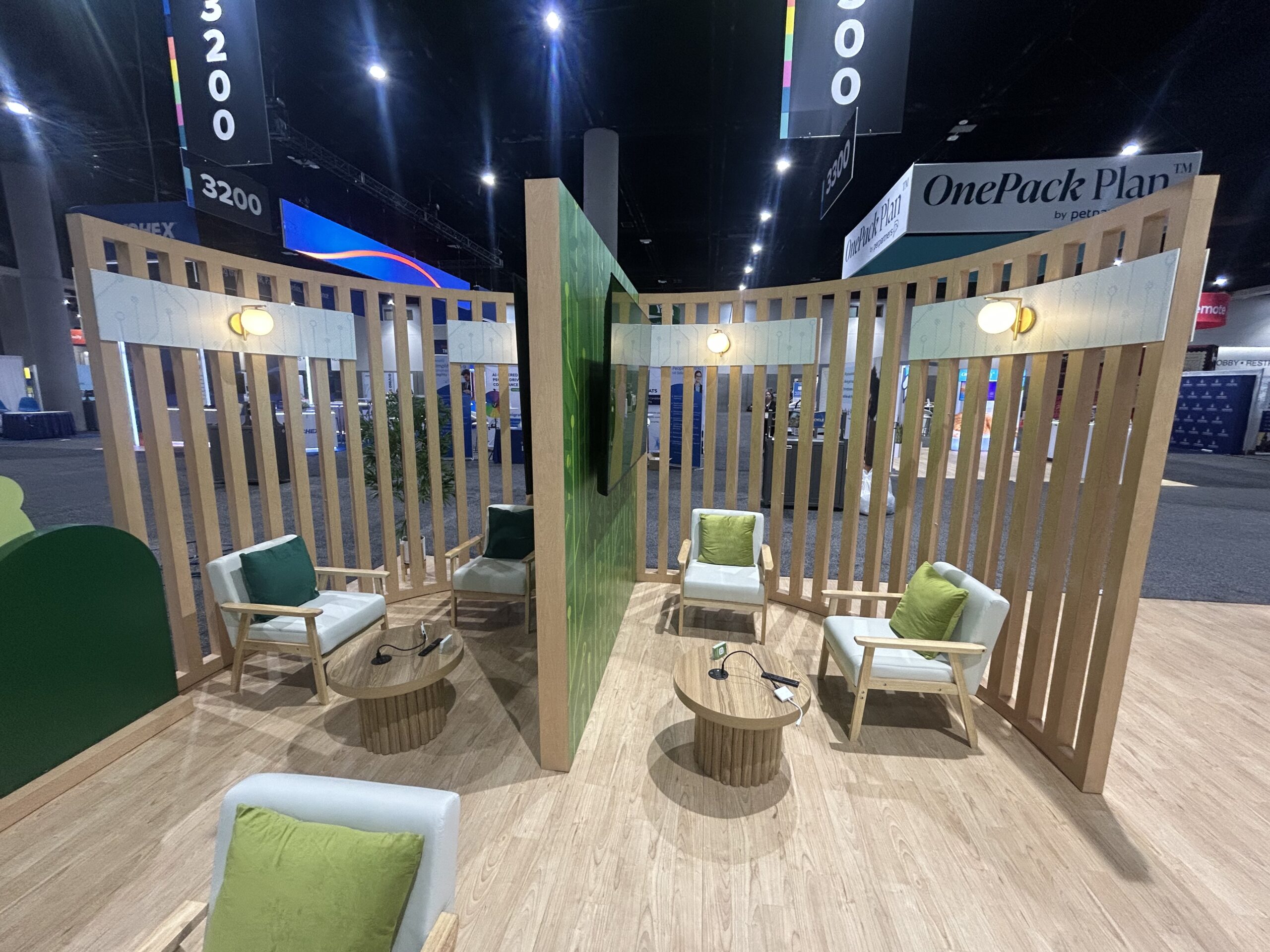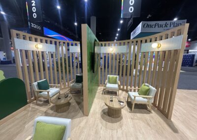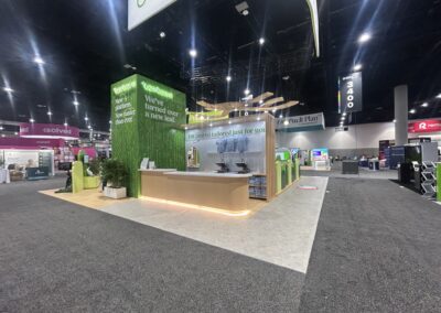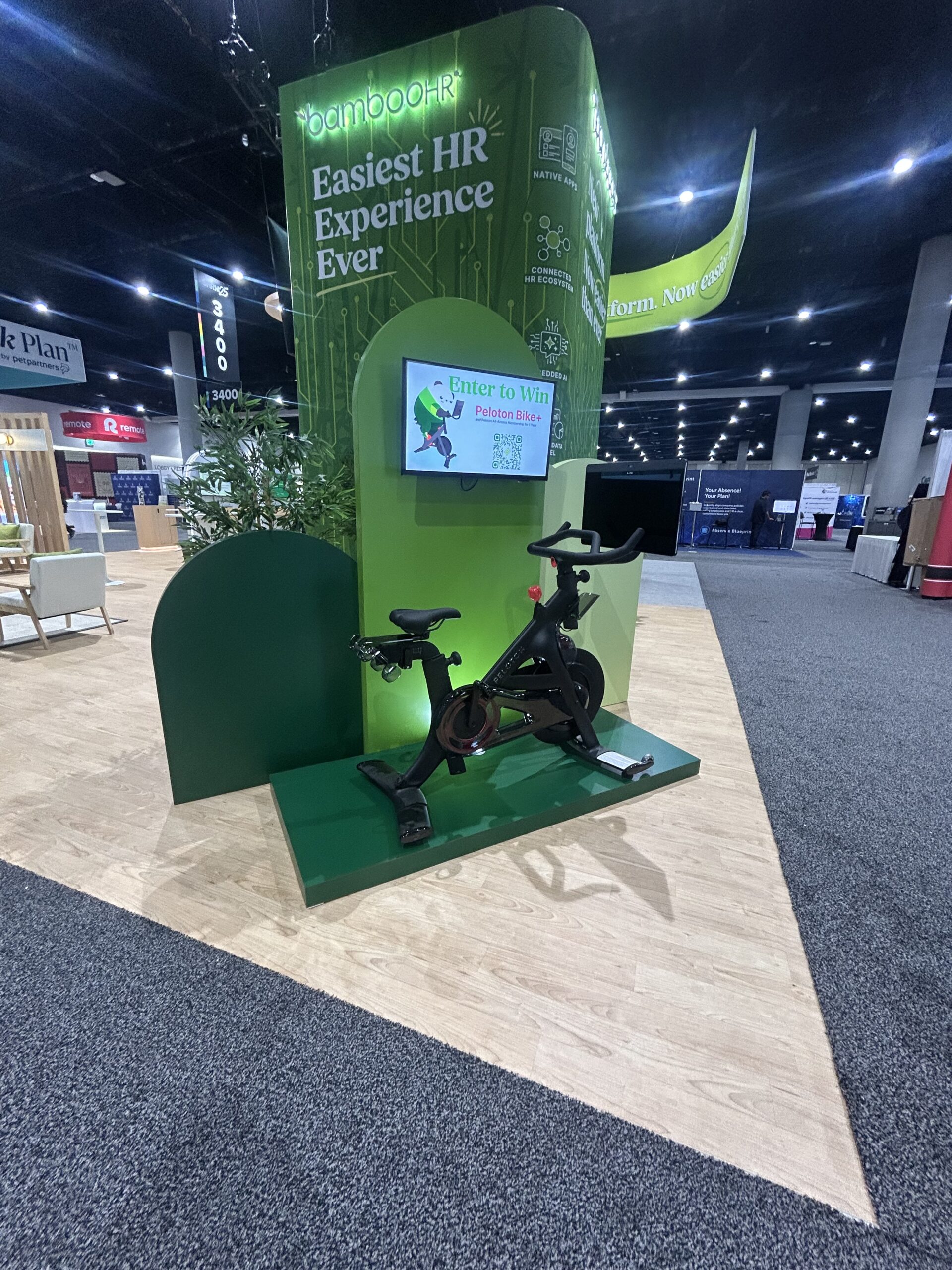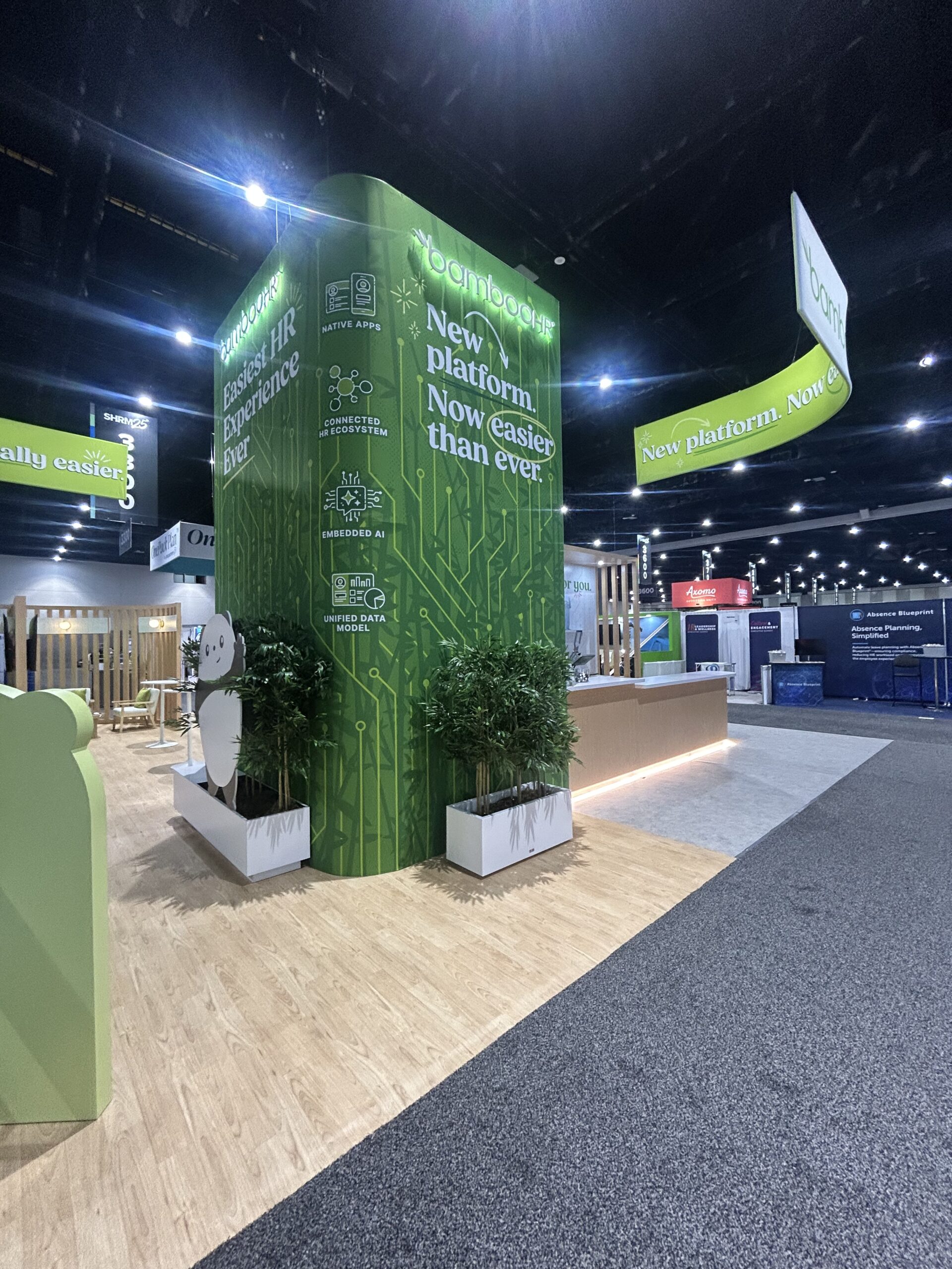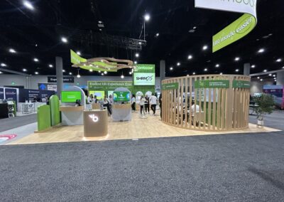 This large, custom-designed booth for BambooHR uses a “nature-meets-tech” aesthetic, leaning heavily into the brand’s signature lime green and wood-toned palette. It successfully balances organic elements (light oak wood floors, slatted wood walls, and potted plants) with modern technology (recessed LED lighting, sleek monitors, and clean typography). The use of floor decals (“This way for fresh-pressed shirts!”) helps with traffic flow and adds a playful touch to the professional setting.