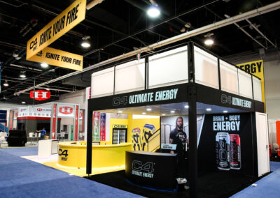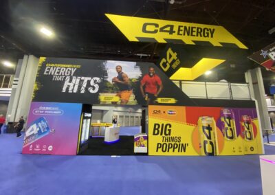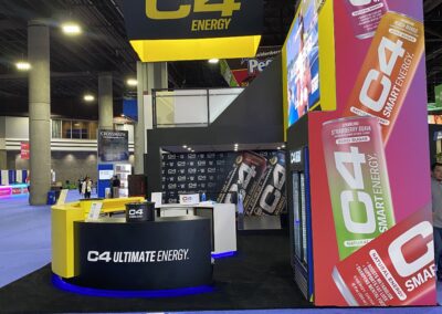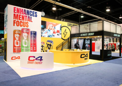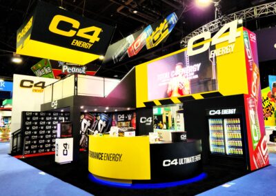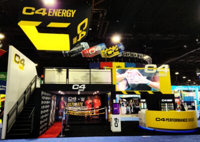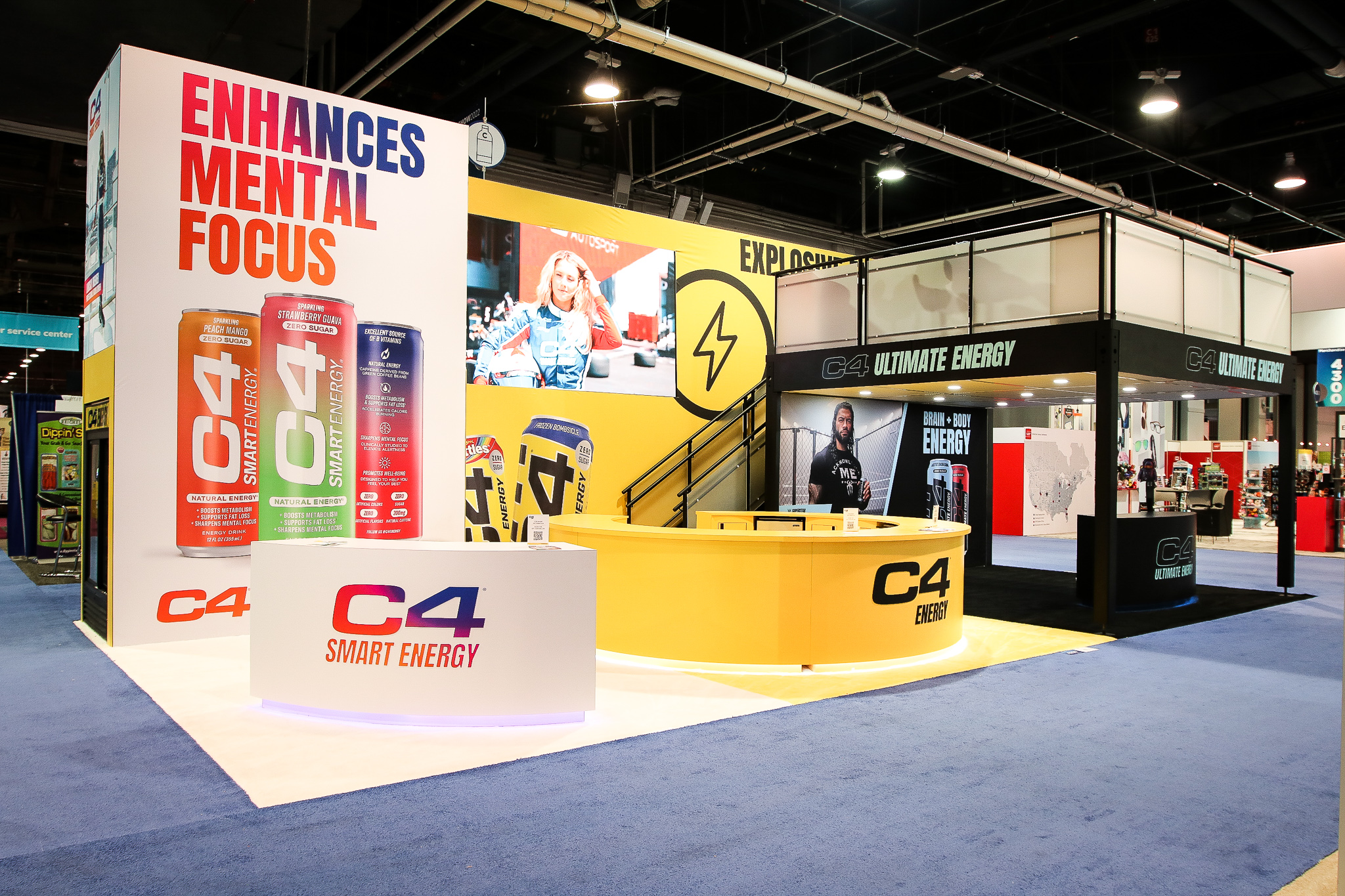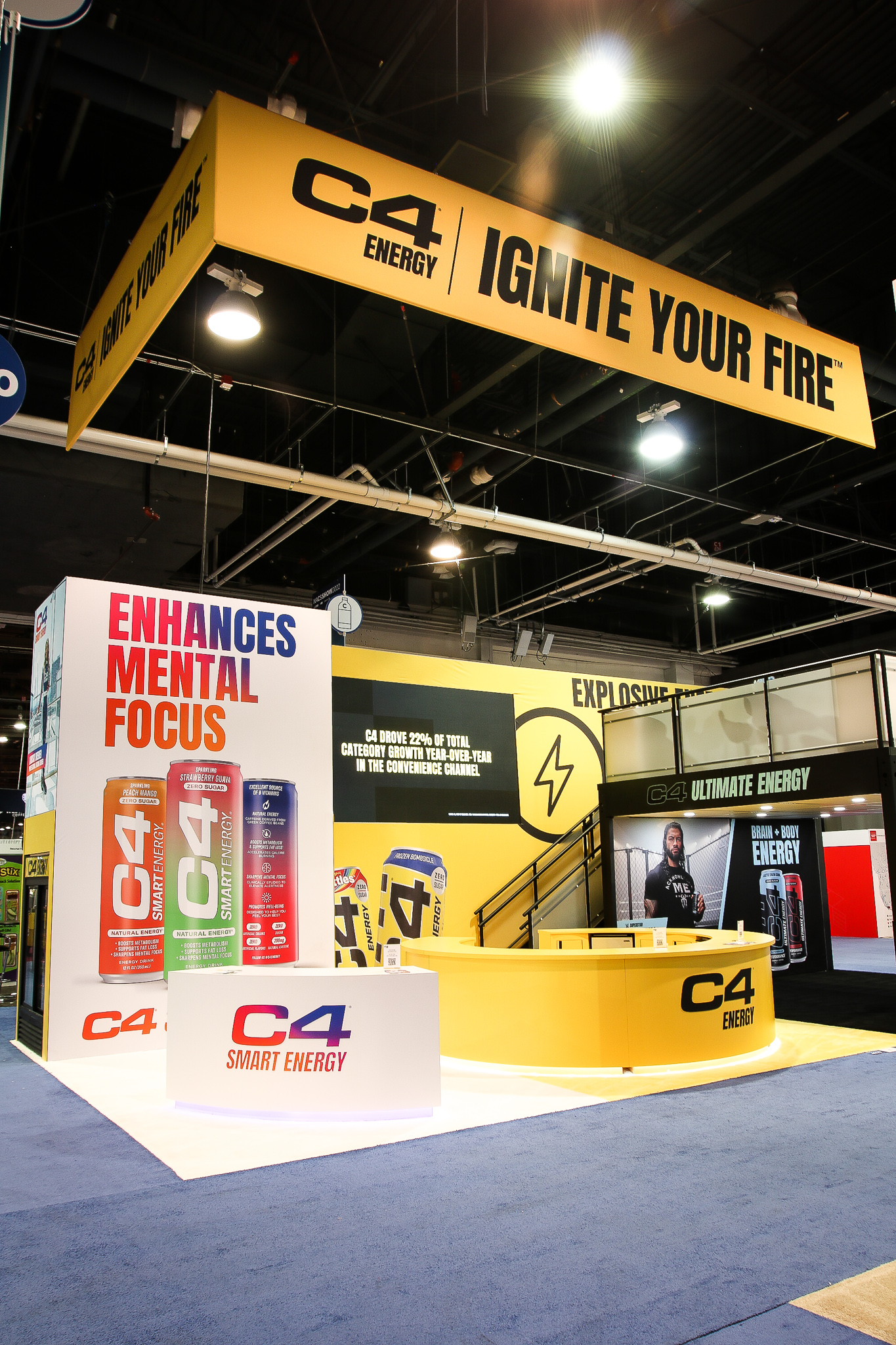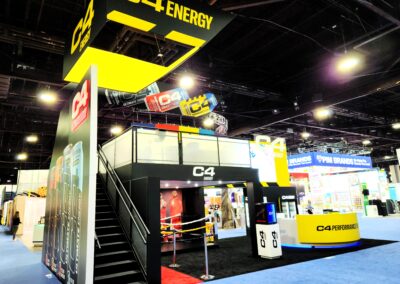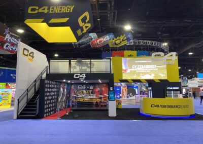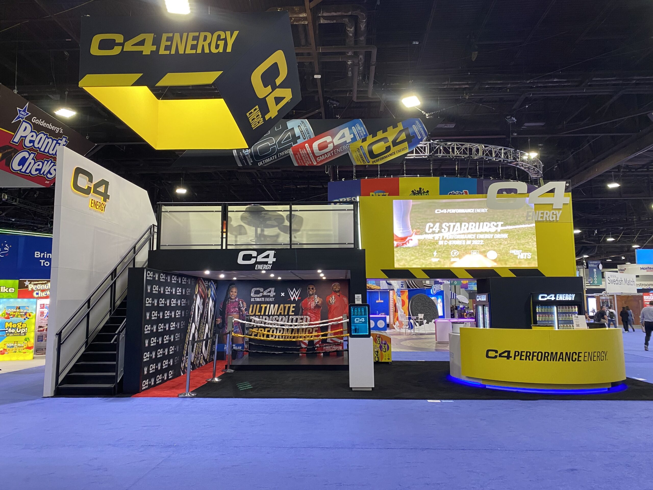 This 20×40 double-deck booth for C4 has been utilized at NACS for the past few years. The large footprint was used for sampling counters and engaging attendees in product conversations. They added a wrestling ring for photo opportunities with WWE stars to attract attendees and other exhibitors, which was a significant success for their social media content.