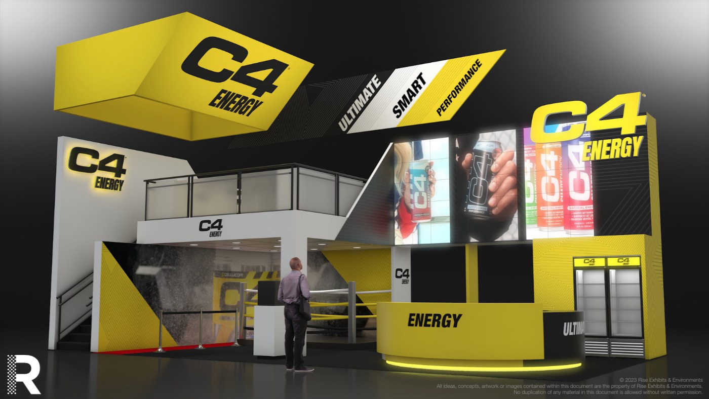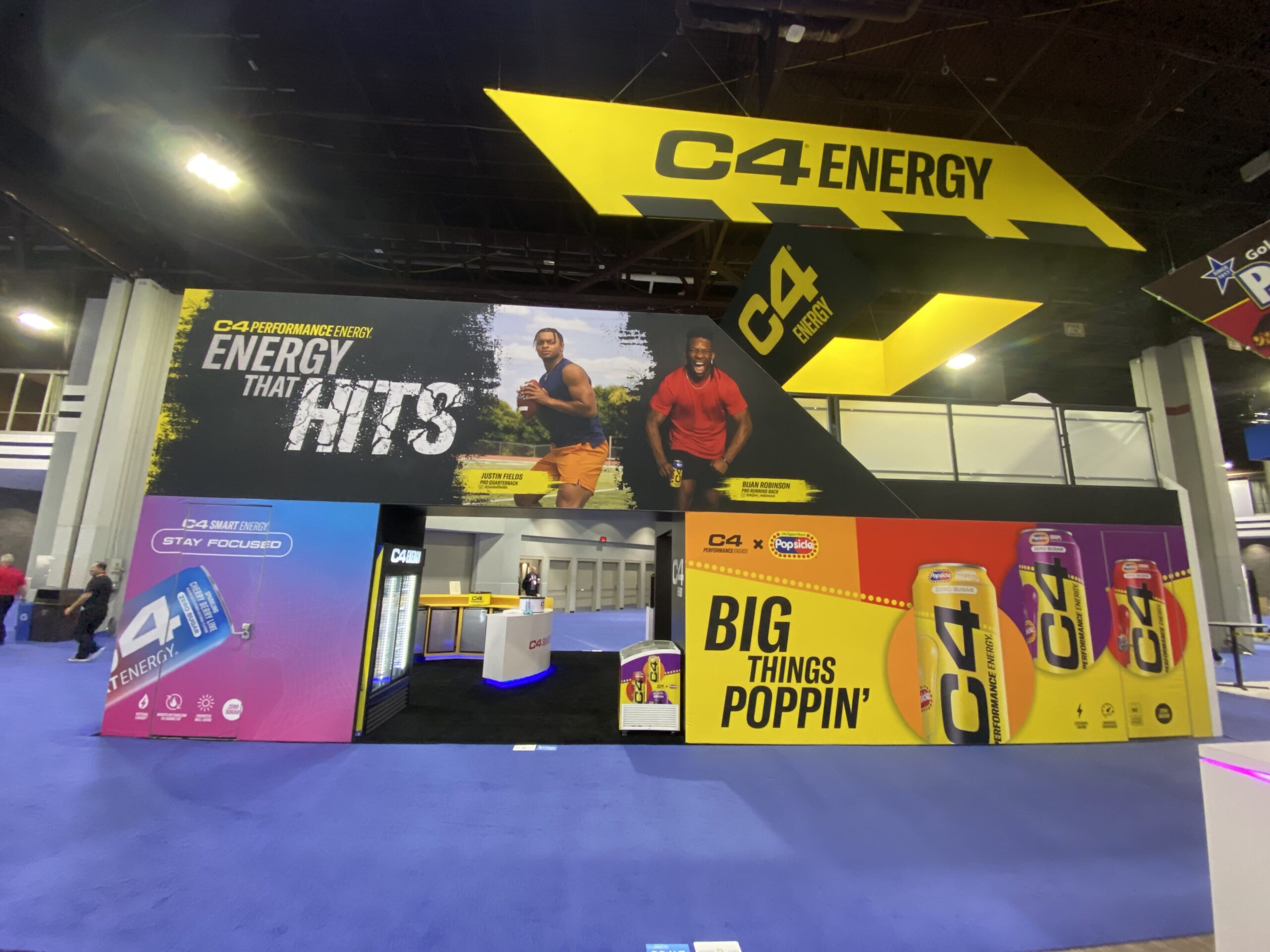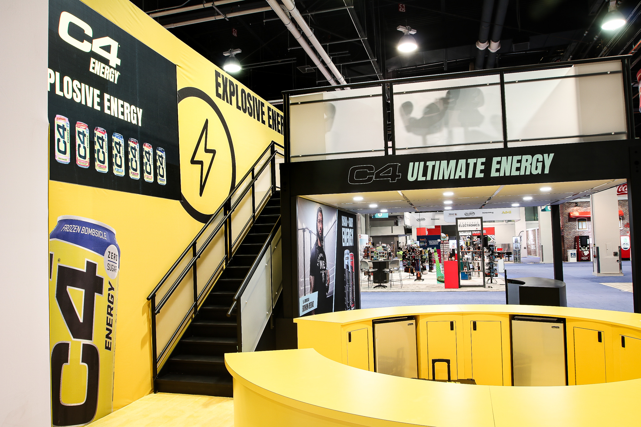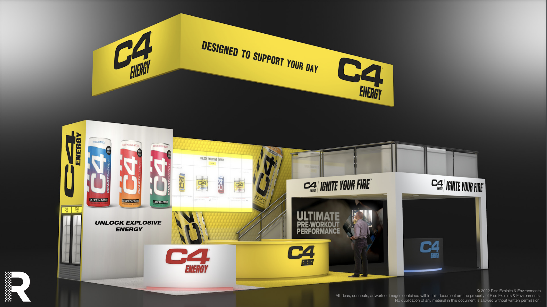 This 20×40 double-deck booth for C4 has been utilized at NACS for the past few years. The large footprint was used for sampling counters and engaging attendees in product conversations. They added a wrestling ring for photo opportunities with WWE stars to attract attendees and other exhibitors, which was a significant success for their social media content.
