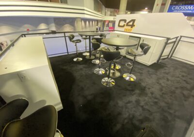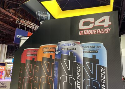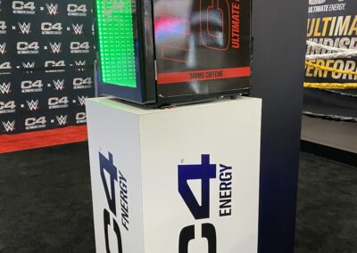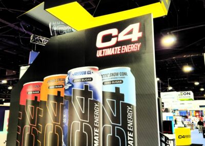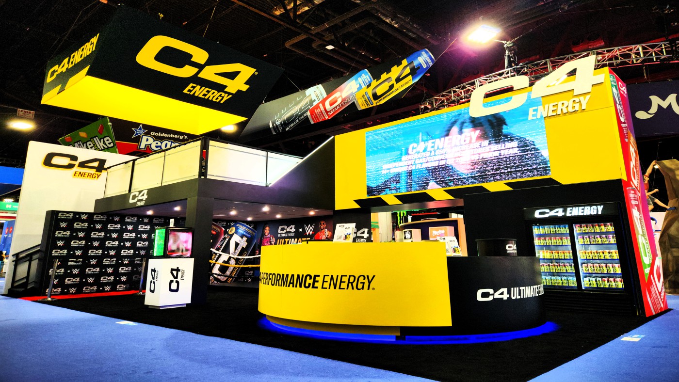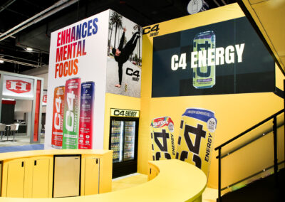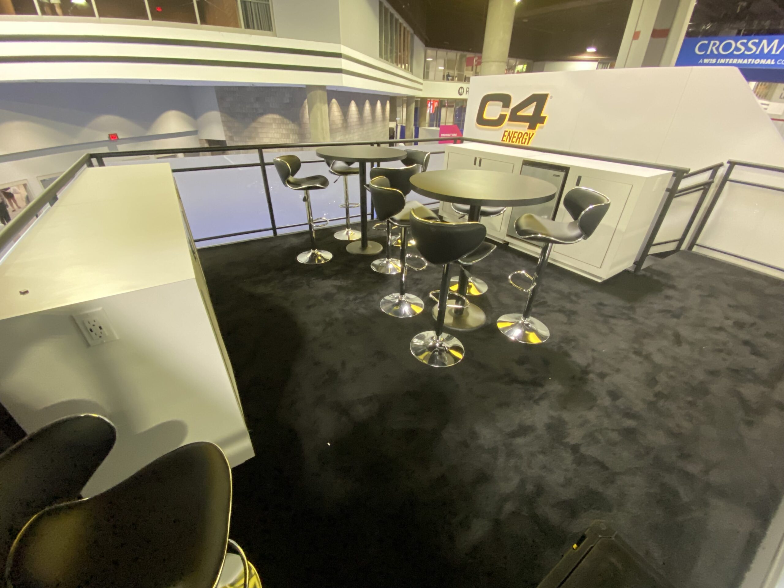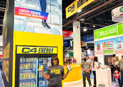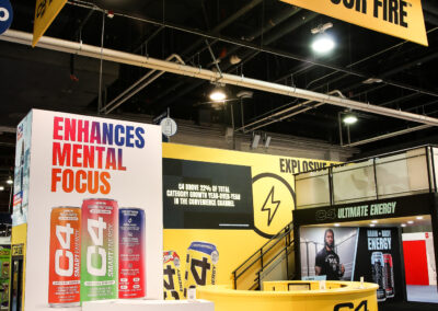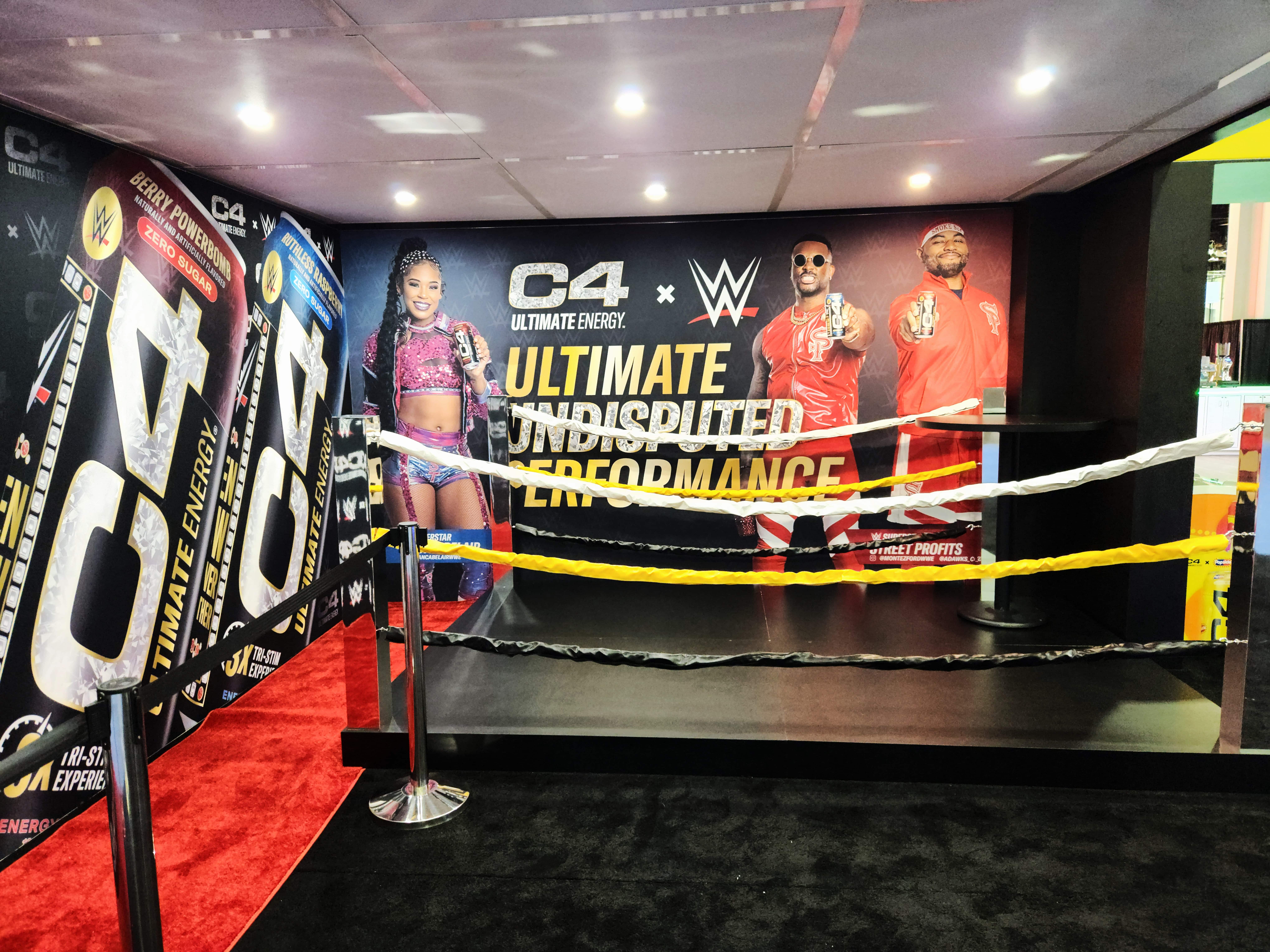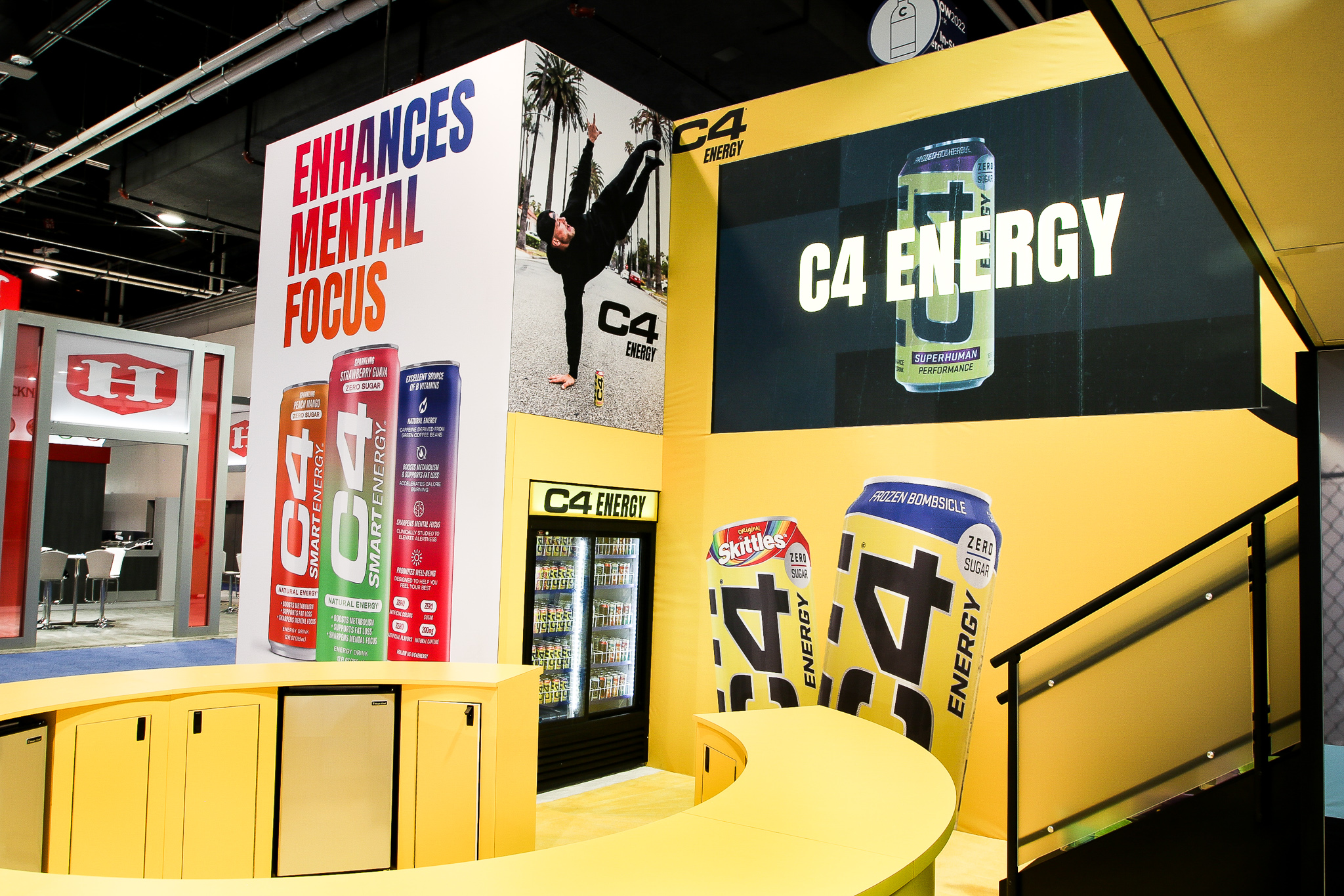 This 20×40 double-deck booth for C4 has been utilized at NACS for the past few years. The large footprint was used for sampling counters and engaging attendees in product conversations. They added a wrestling ring for photo opportunities with WWE stars to attract attendees and other exhibitors, which was a significant success for their social media content.