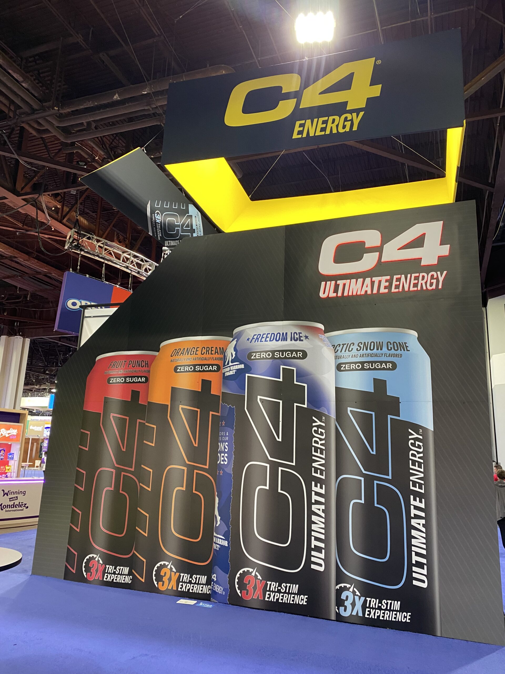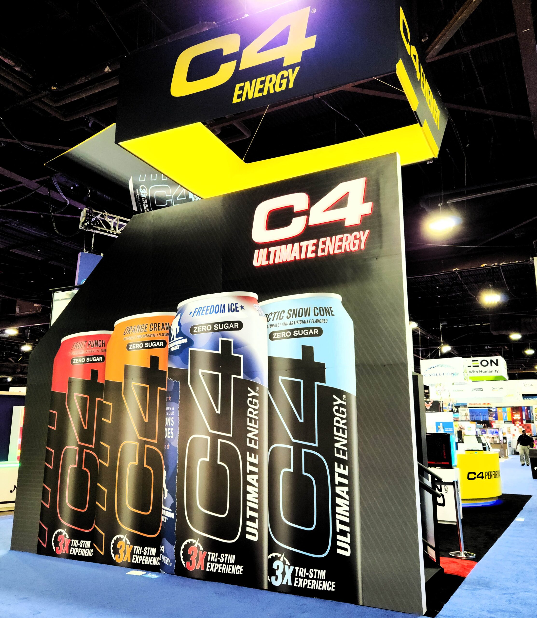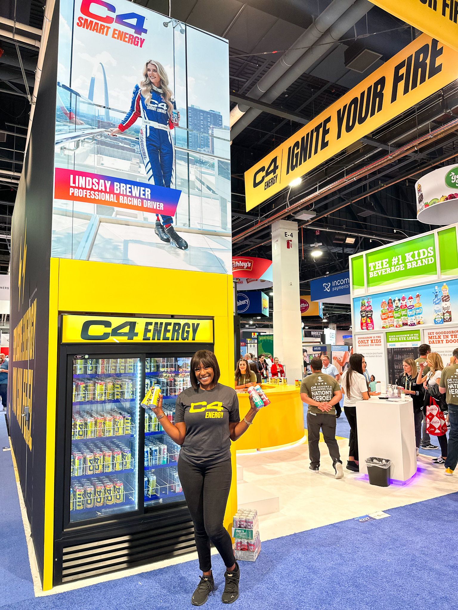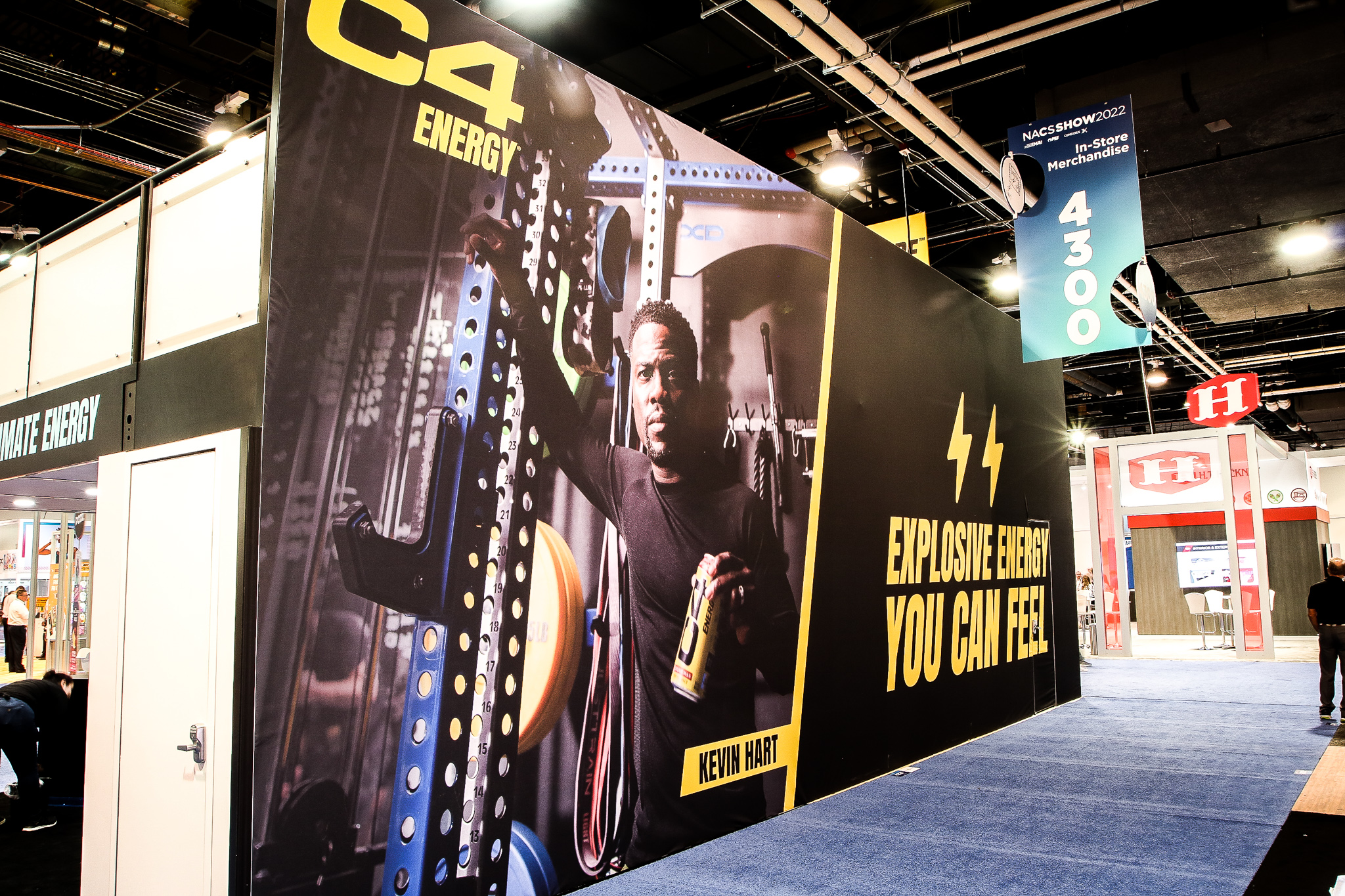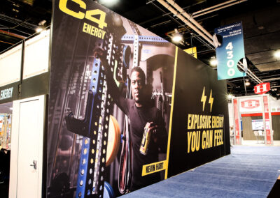 This 20×40 double-deck booth for C4 has been utilized at NACS for the past few years. The large footprint was used for sampling counters and engaging attendees in product conversations. They added a wrestling ring for photo opportunities with WWE stars to attract attendees and other exhibitors, which was a significant success for their social media content.