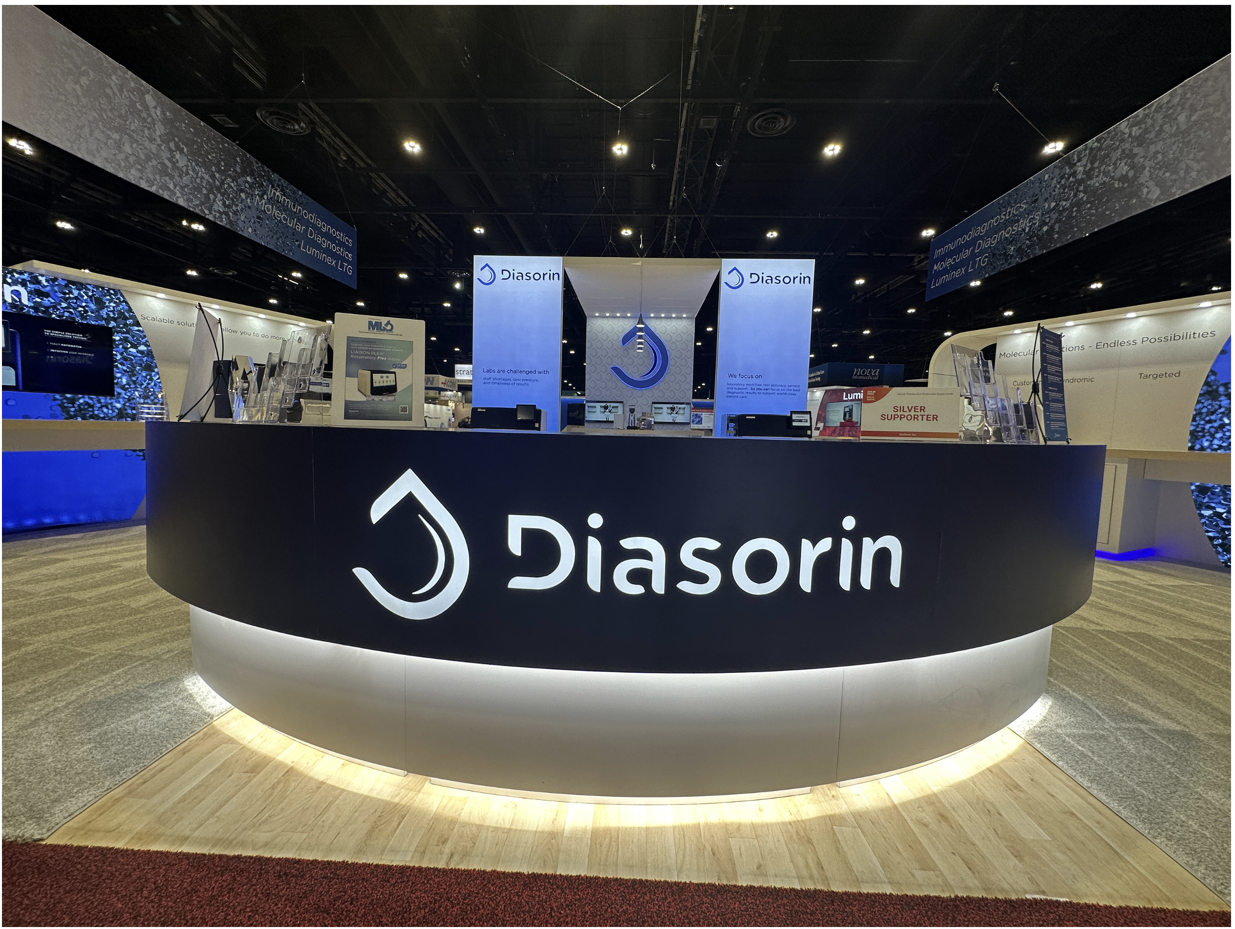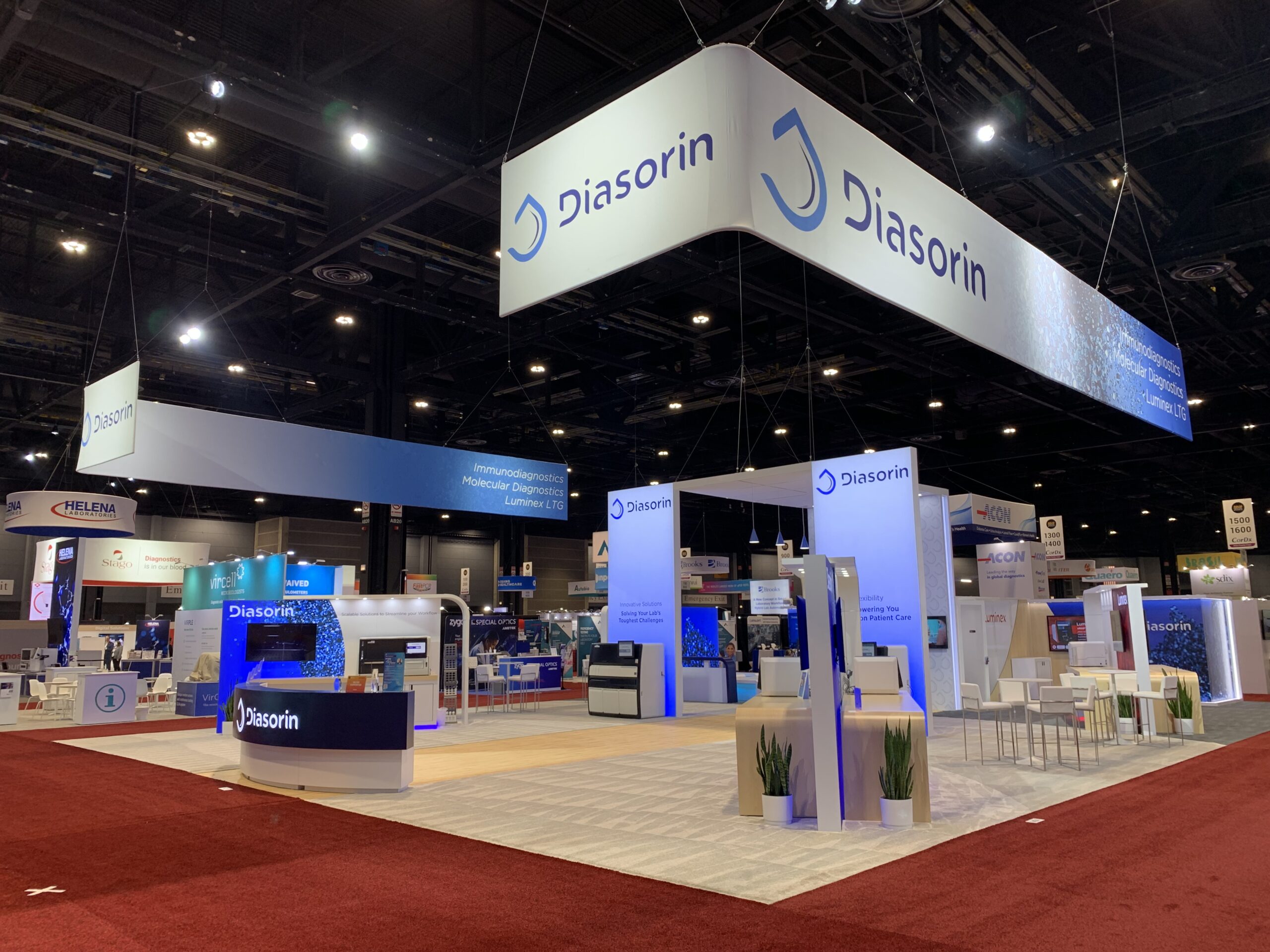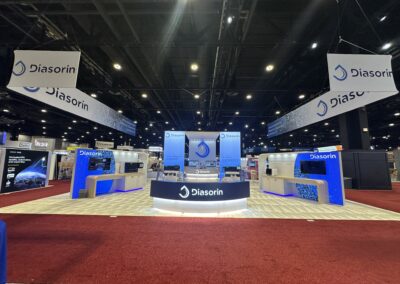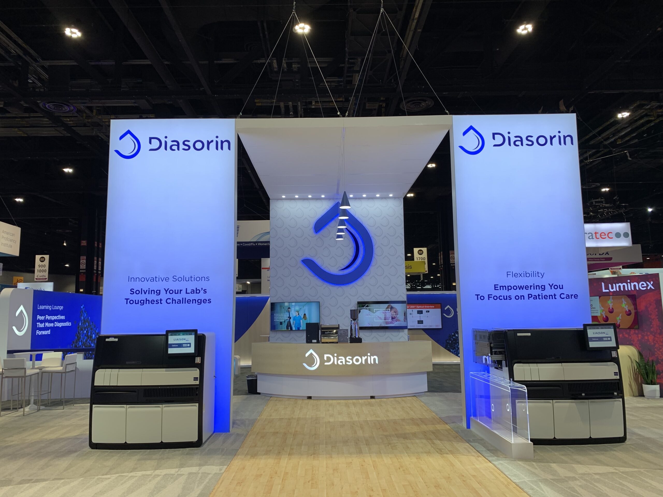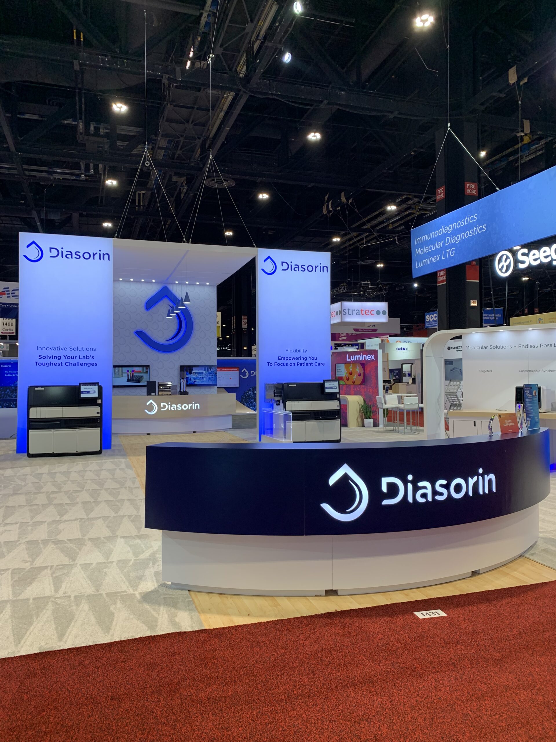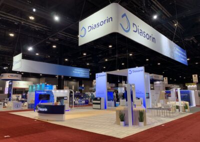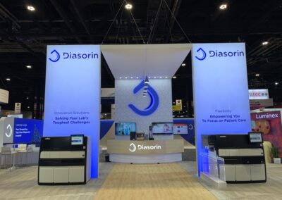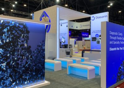 This showcases a large, custom tradeshow booth for Diasorin, a global leader in the laboratory diagnostics market. The booth features a clean, high-tech aesthetic dominated by a white and “Diasorin blue” color palette, utilizing bright LED backlighting and modern architectural lines.