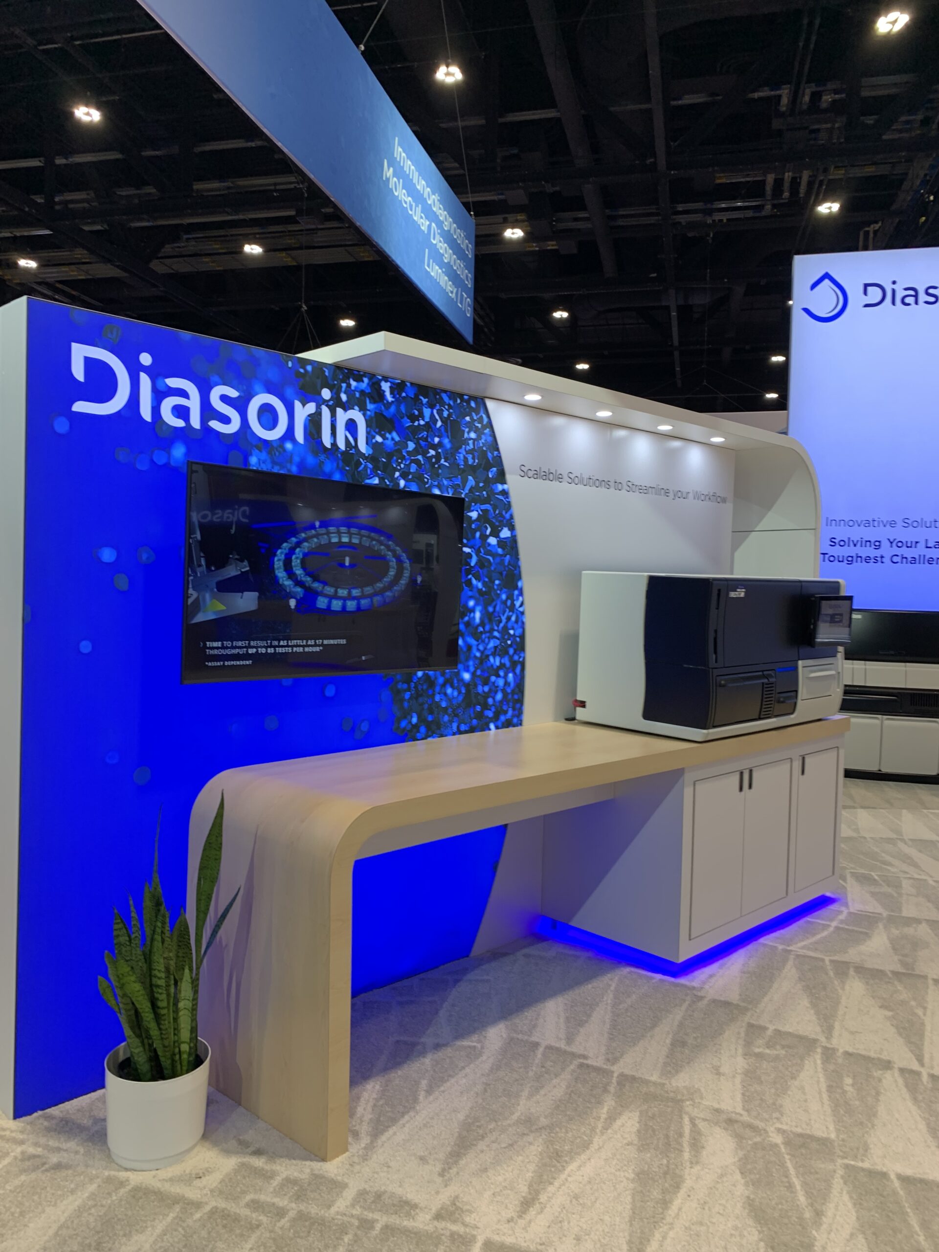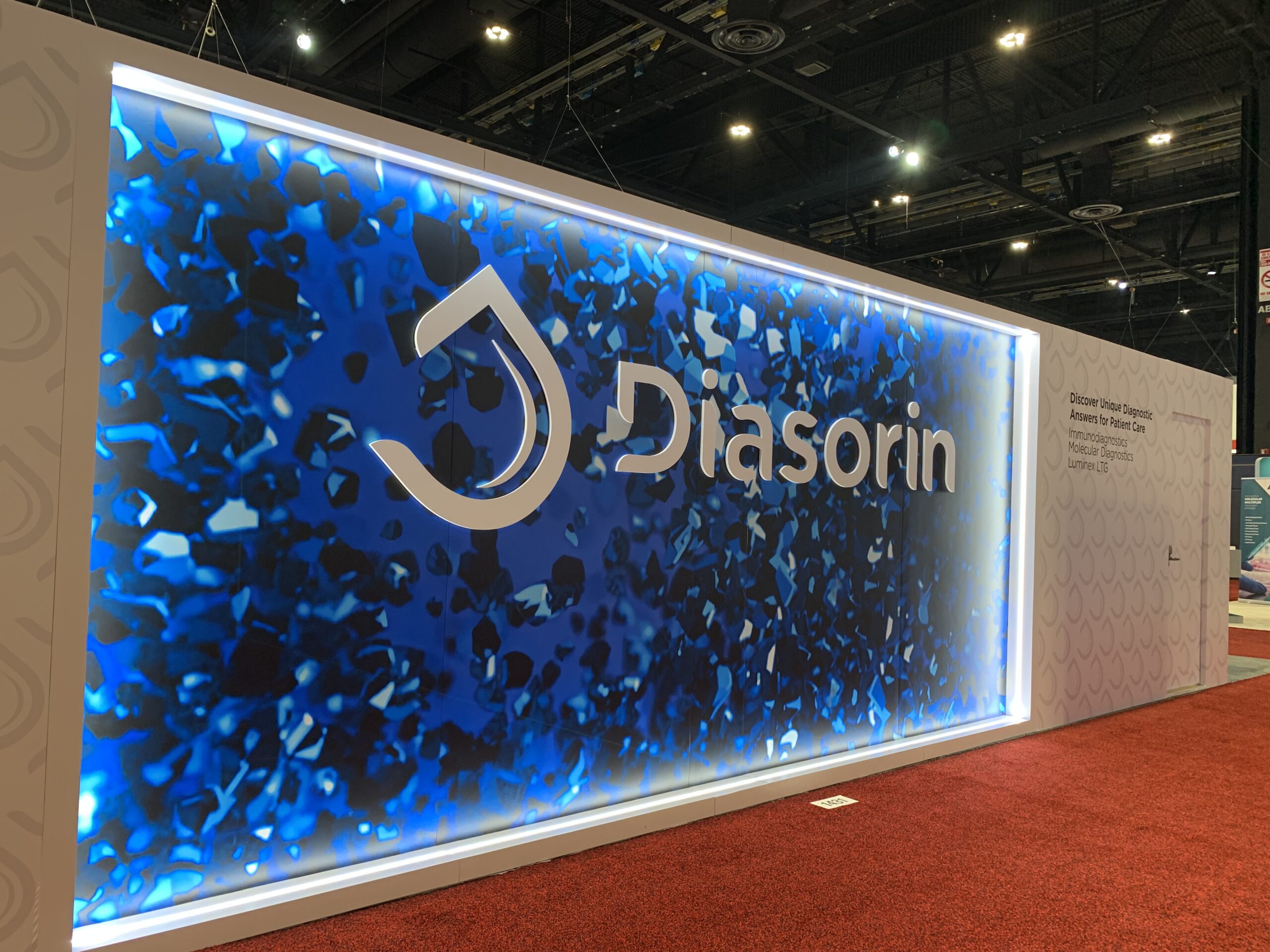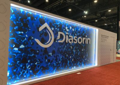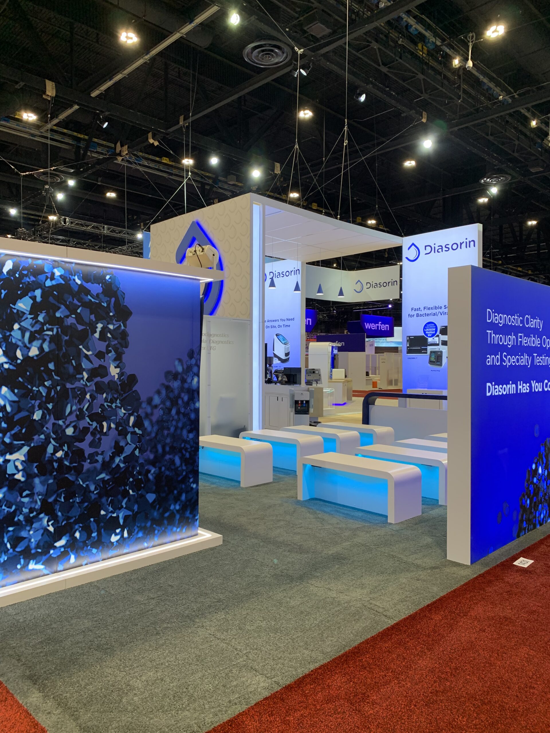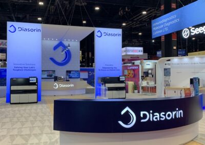 This showcases a large, custom tradeshow booth for Diasorin, a global leader in the laboratory diagnostics market. The booth features a clean, high-tech aesthetic dominated by a white and “Diasorin blue” color palette, utilizing bright LED backlighting and modern architectural lines.