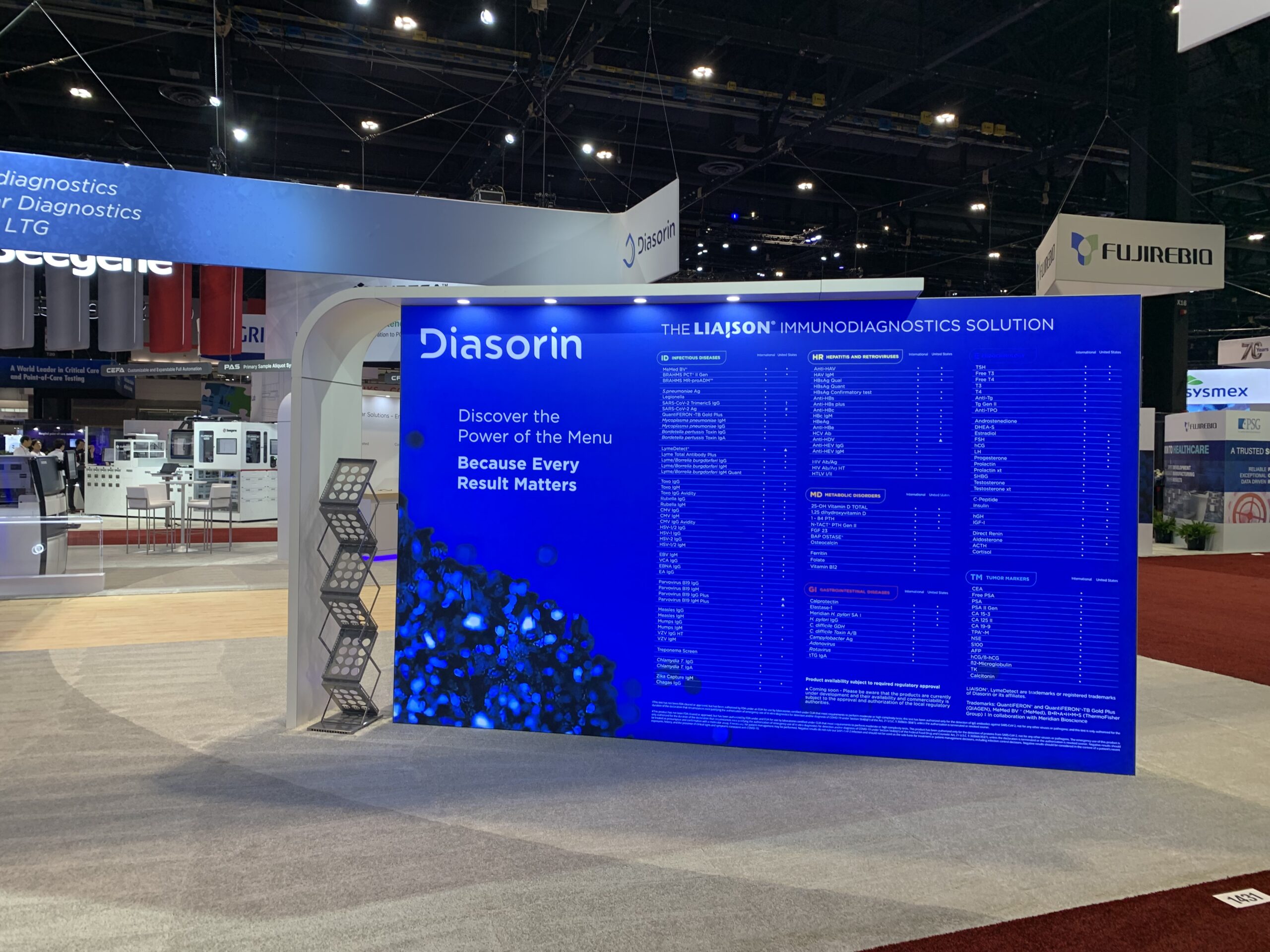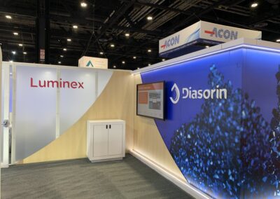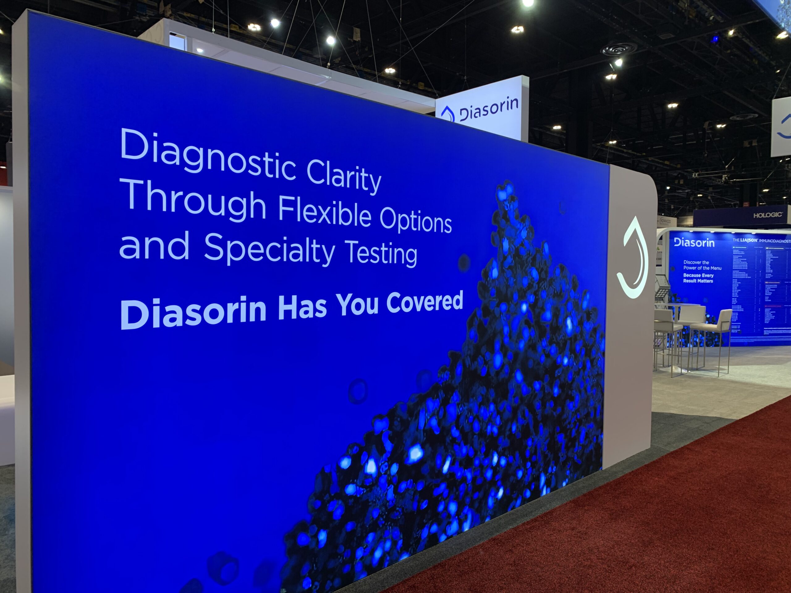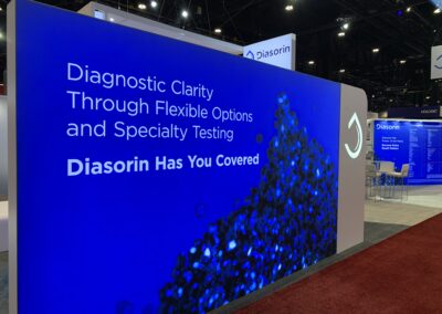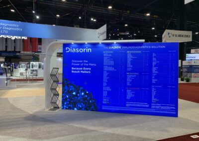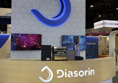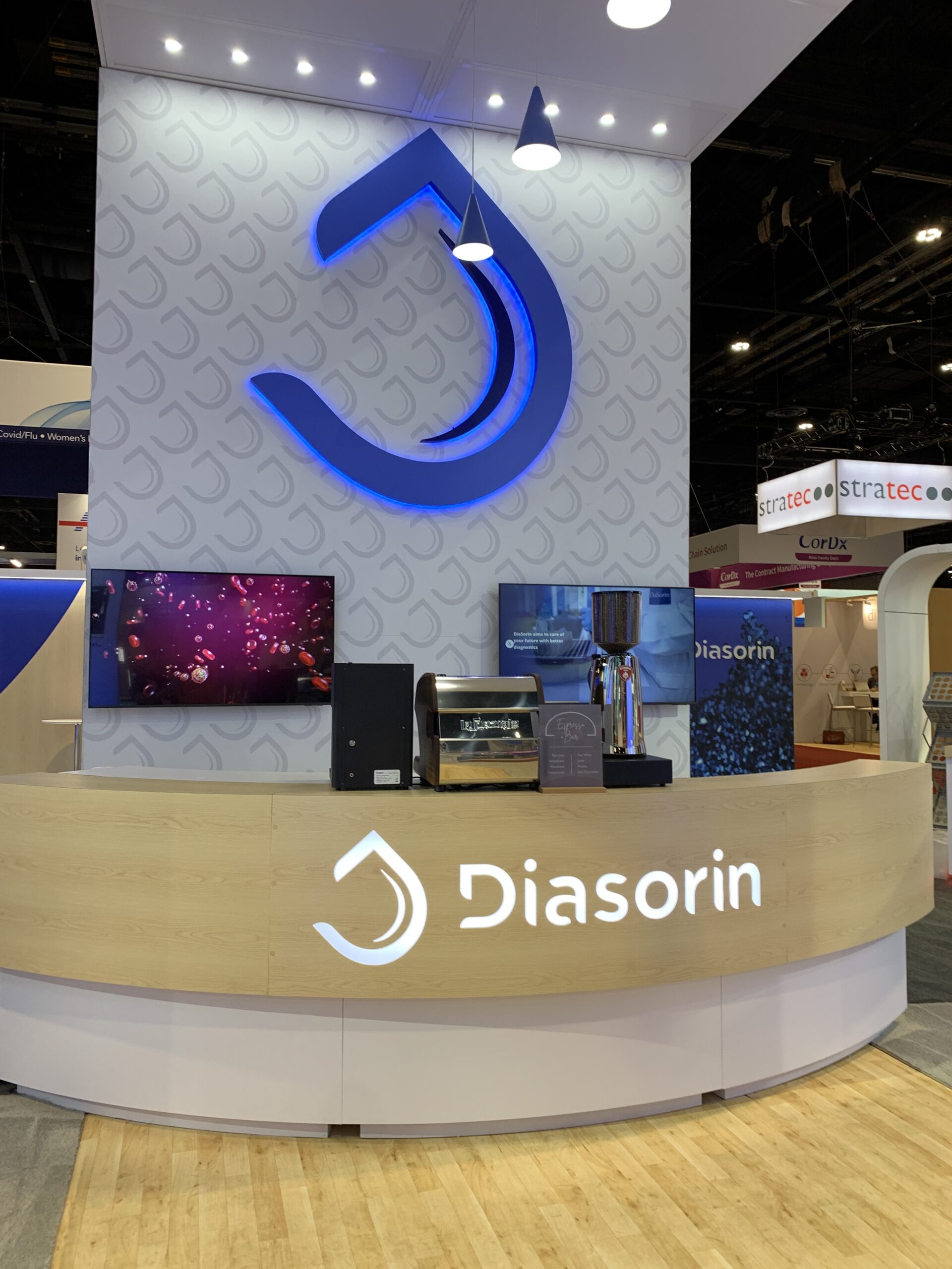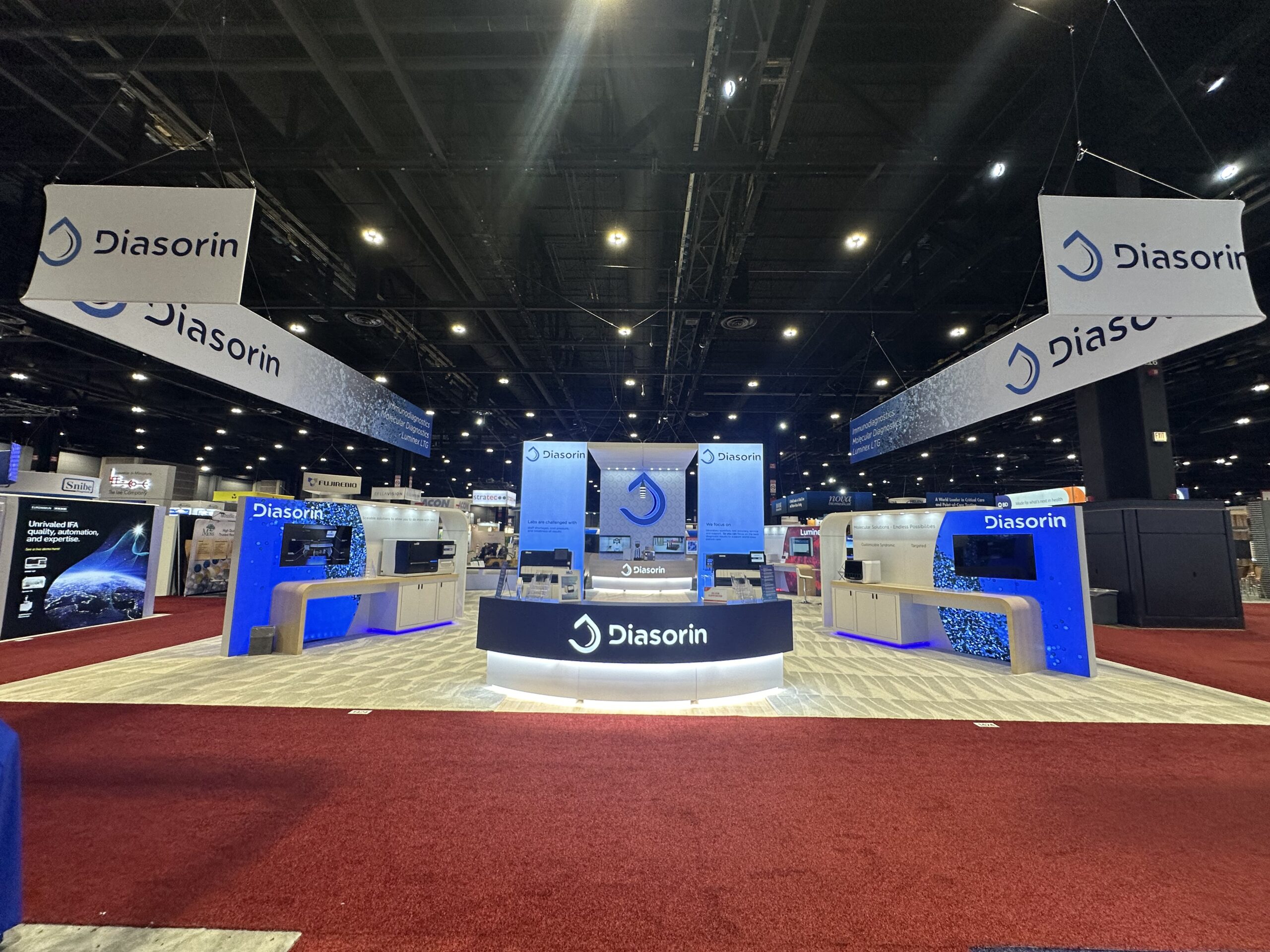 This showcases a large, custom tradeshow booth for Diasorin, a global leader in the laboratory diagnostics market. The booth features a clean, high-tech aesthetic dominated by a white and “Diasorin blue” color palette, utilizing bright LED backlighting and modern architectural lines.