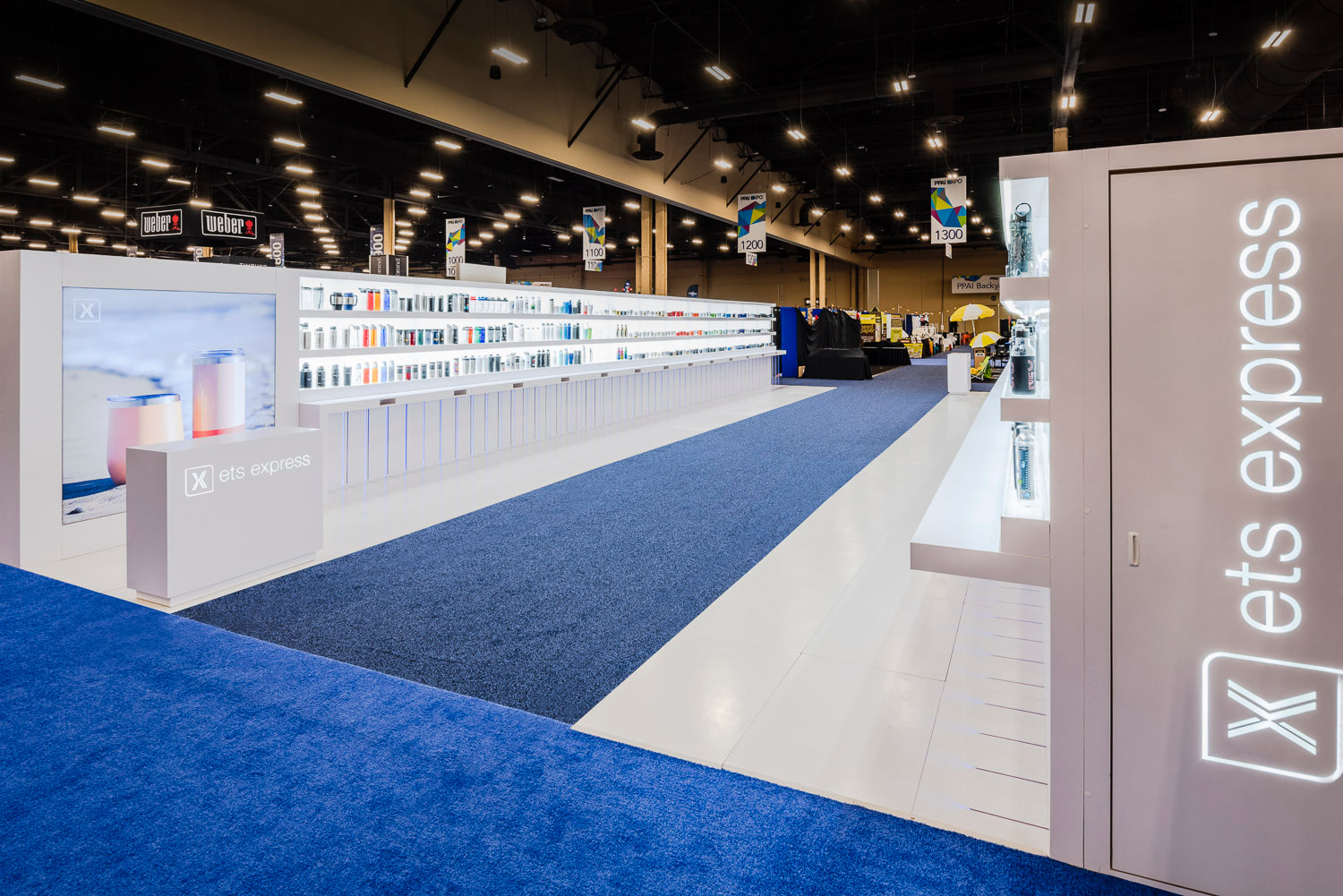 The ETS exhibit features two 10×60 booth structures separated by a central aisle. Product displays are arranged on long shelving and highlighted by backlit acrylic to ensure the merchandise stands out. Over 60,000 LED lights were used to create this unique installation. The booth has been nicknamed the “ETS Village” by show attendees because it is impossible to miss once you turn down the aisle.