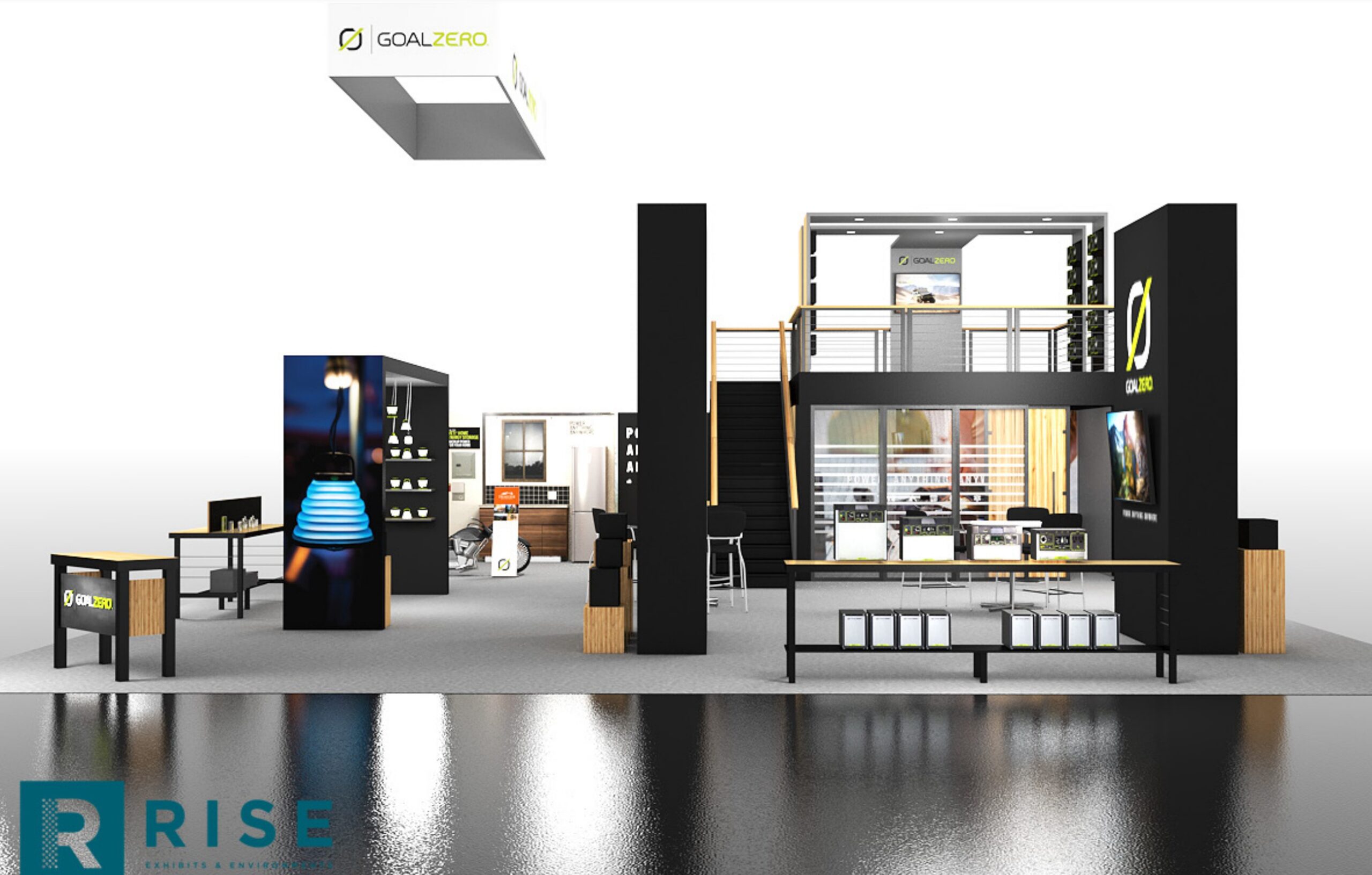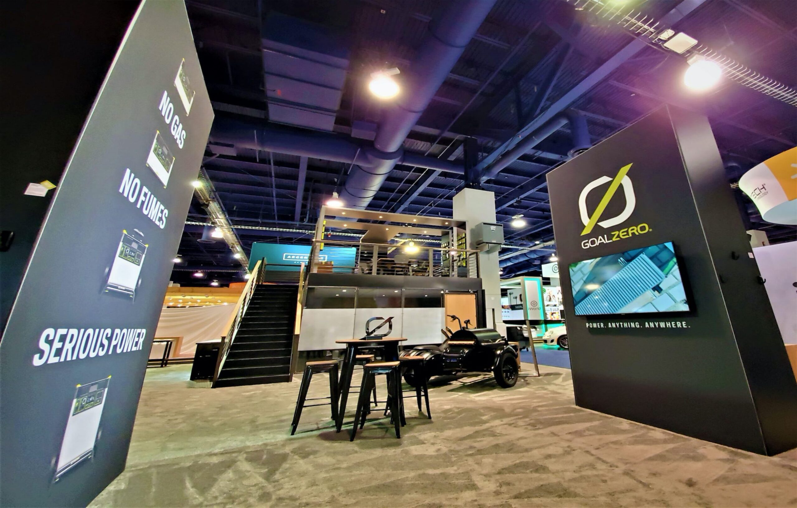 GoalZero is a custom booth featuring a double-deck structure with an industrial design aesthetic. The conference rooms were specifically designed to integrate with the deck structure, and we incorporated soundproofing at the client’s request. To complete the design, custom welded handrails were added to provide the perfect finishing touch for this CES booth.