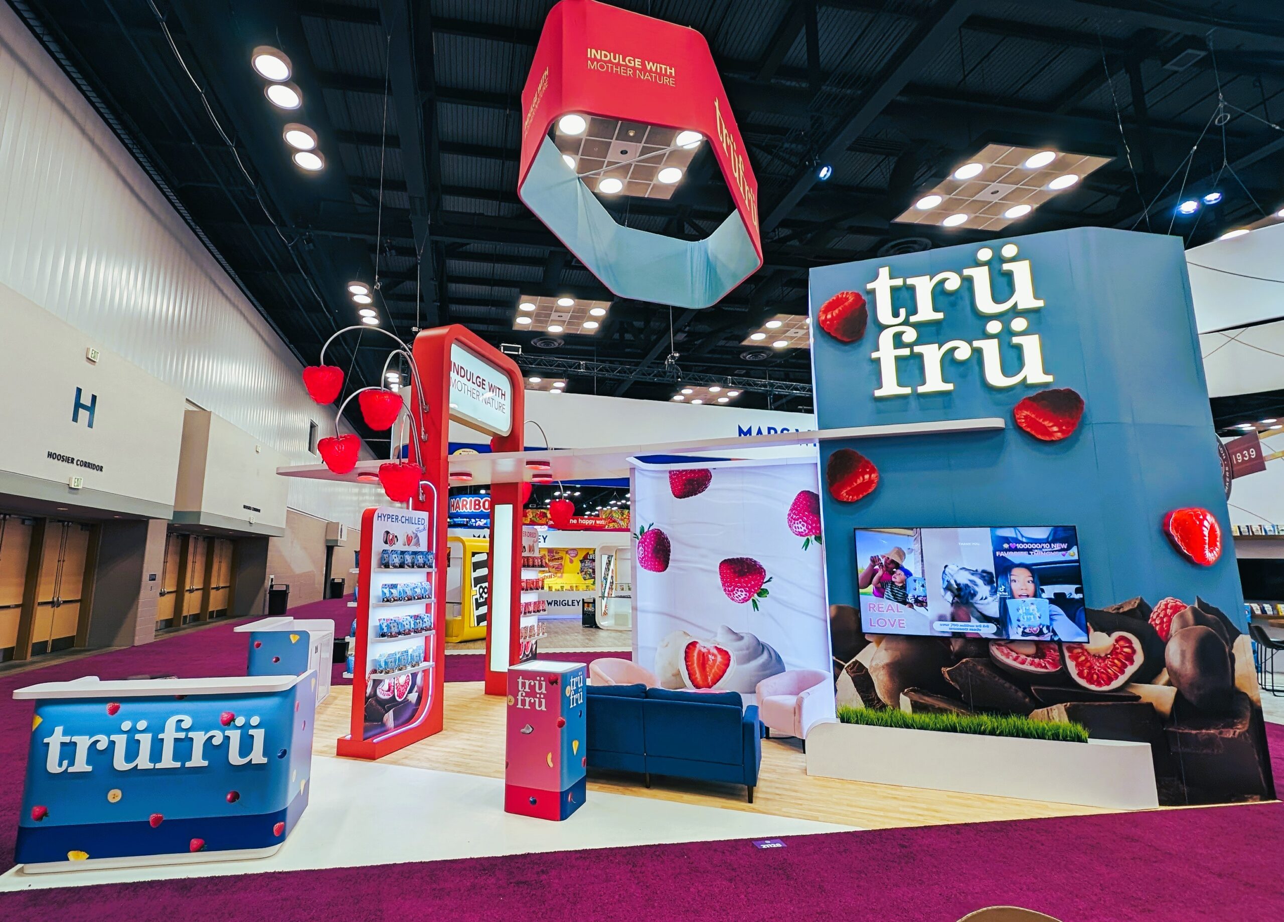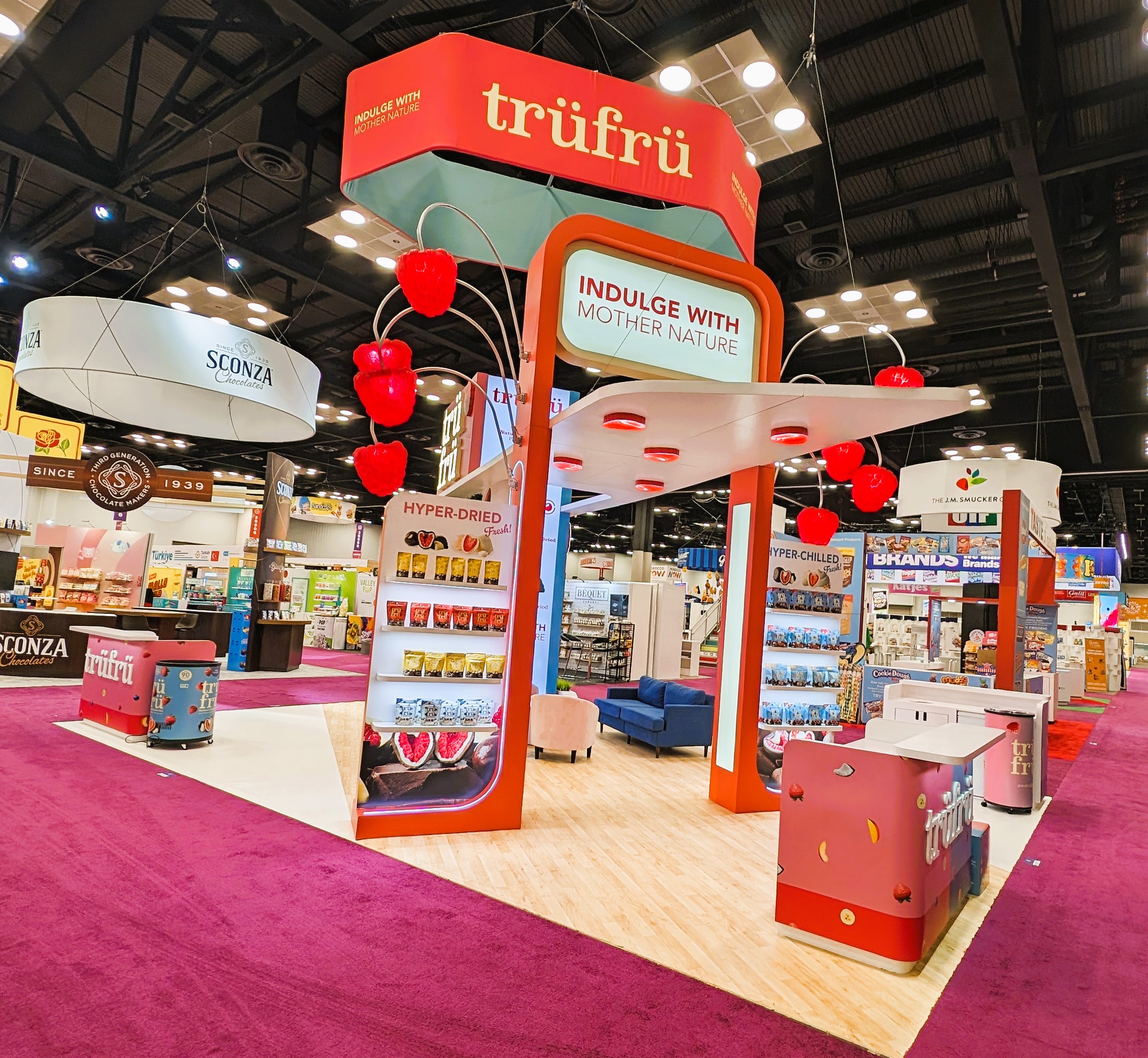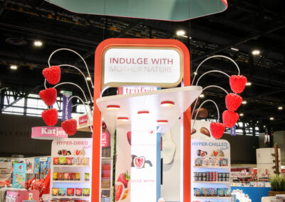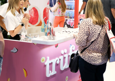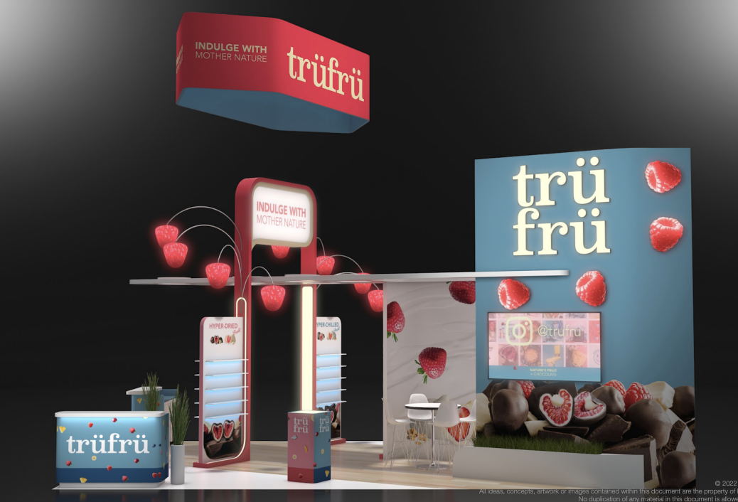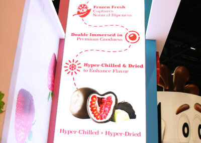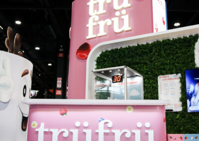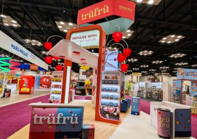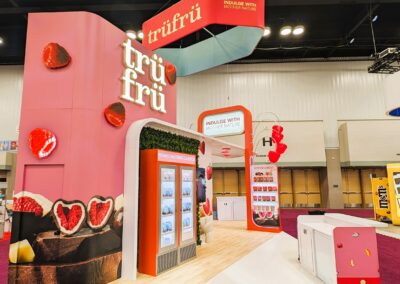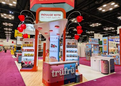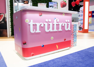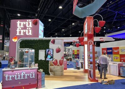 The design for the Tru Fru 20×30 booth was centered around the client’s request for a “fun and whimsical” atmosphere. To achieve this and reinforce the brand’s identity, we integrated 3D-printed lighted raspberries into the space to add a playful element. Additionally, we positioned the booth at an angle to maximize the available space and optimize traffic flow, ensuring attendees can easily move through the area to sample the product.