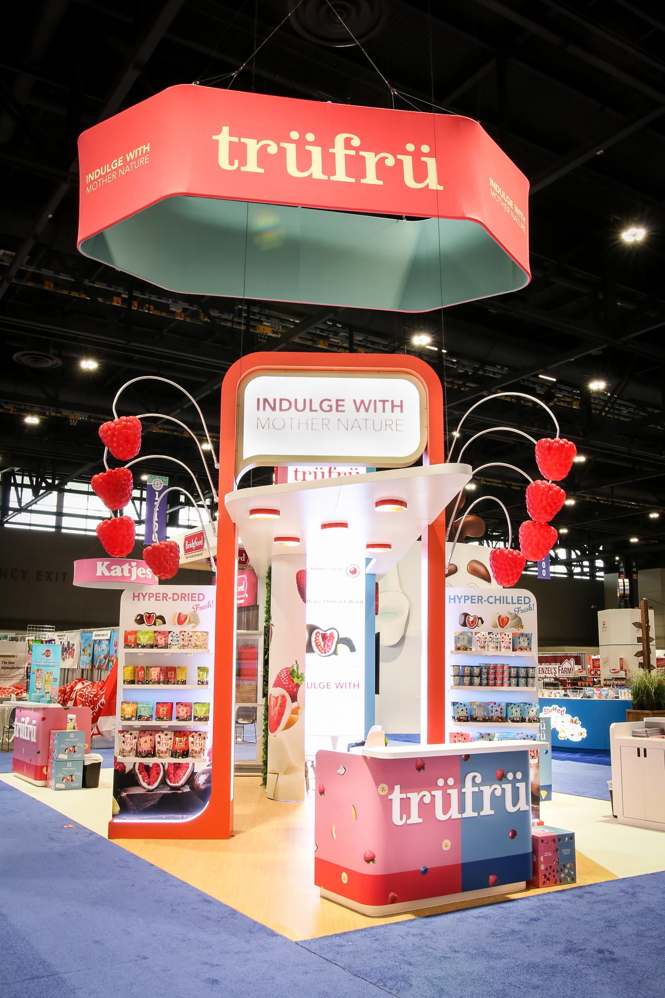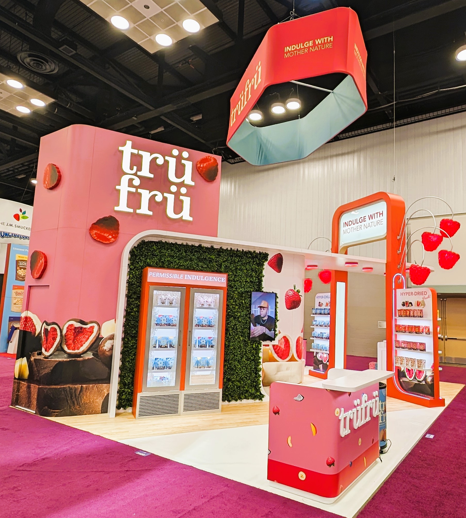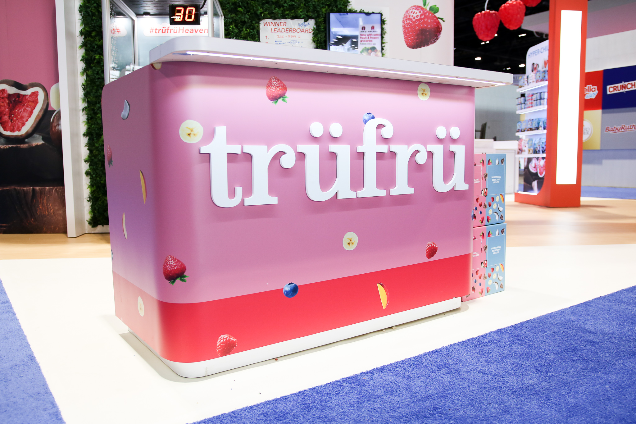 The design for the Tru Fru 20×30 booth was centered around the client’s request for a “fun and whimsical” atmosphere. To achieve this and reinforce the brand’s identity, we integrated 3D-printed lighted raspberries into the space to add a playful element. Additionally, we positioned the booth at an angle to maximize the available space and optimize traffic flow, ensuring attendees can easily move through the area to sample the product.