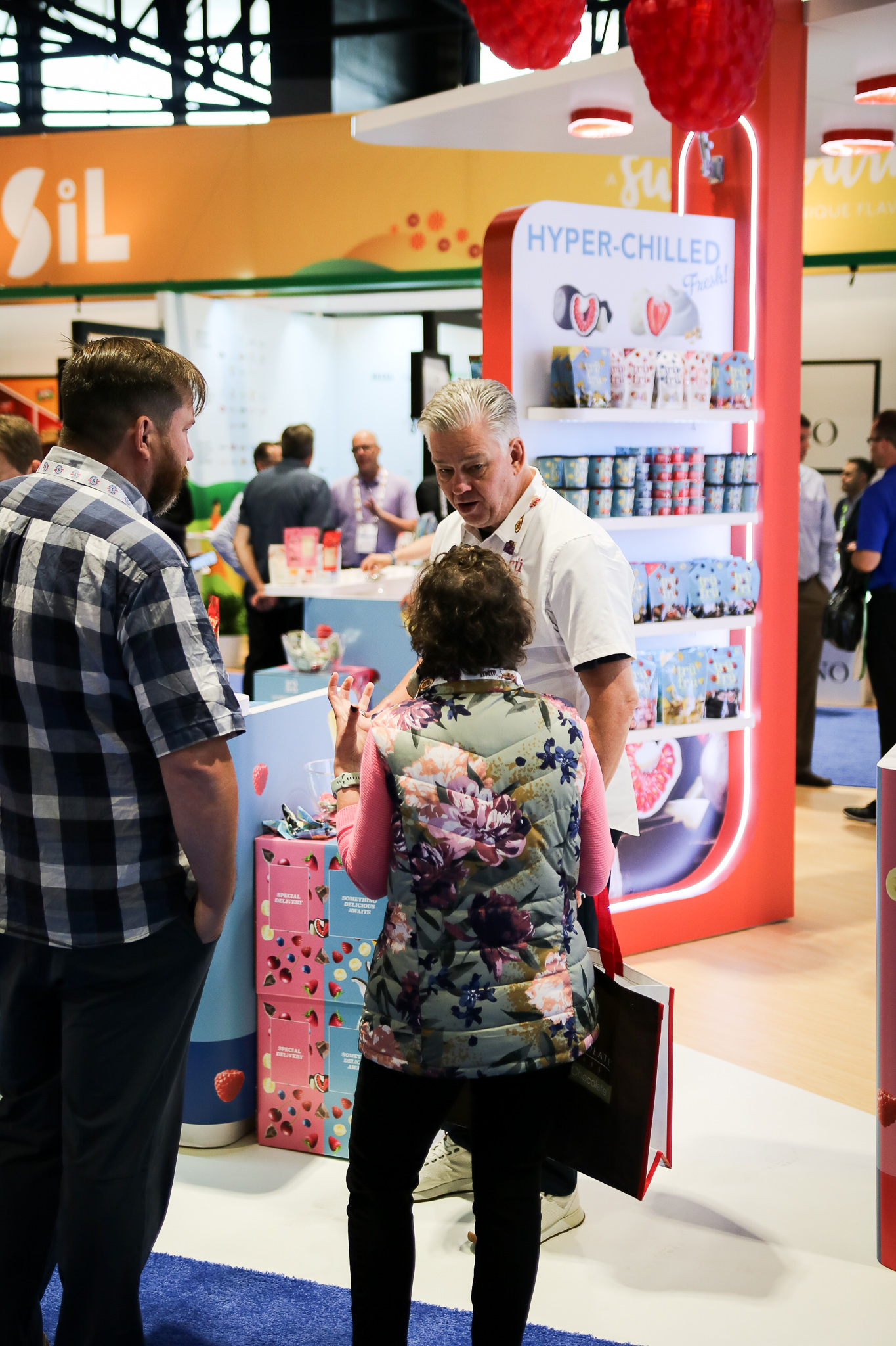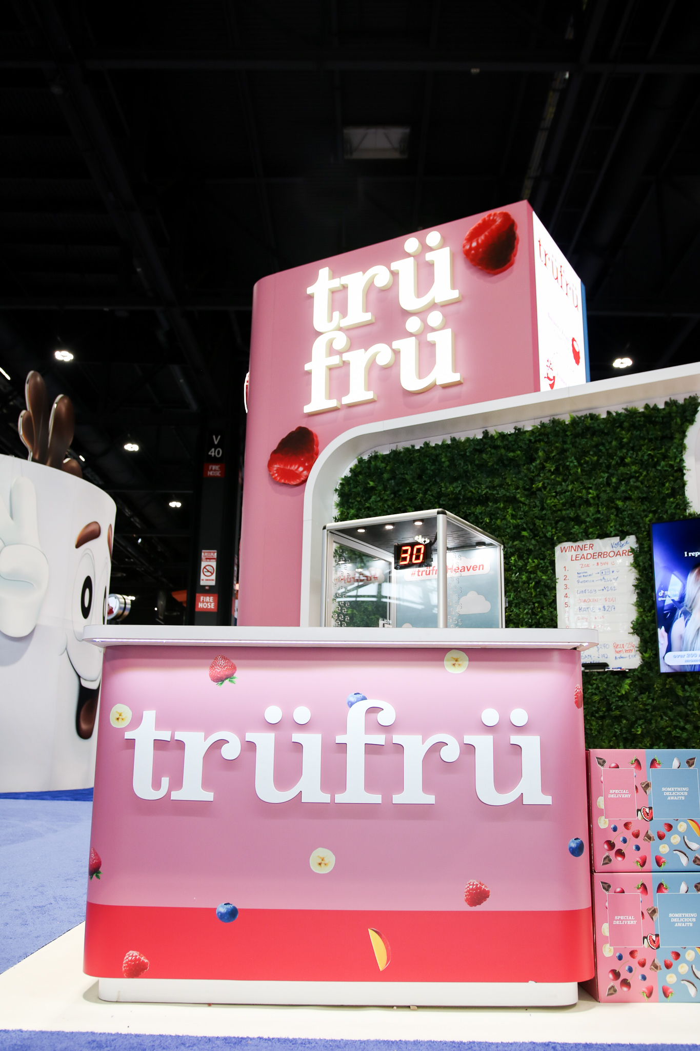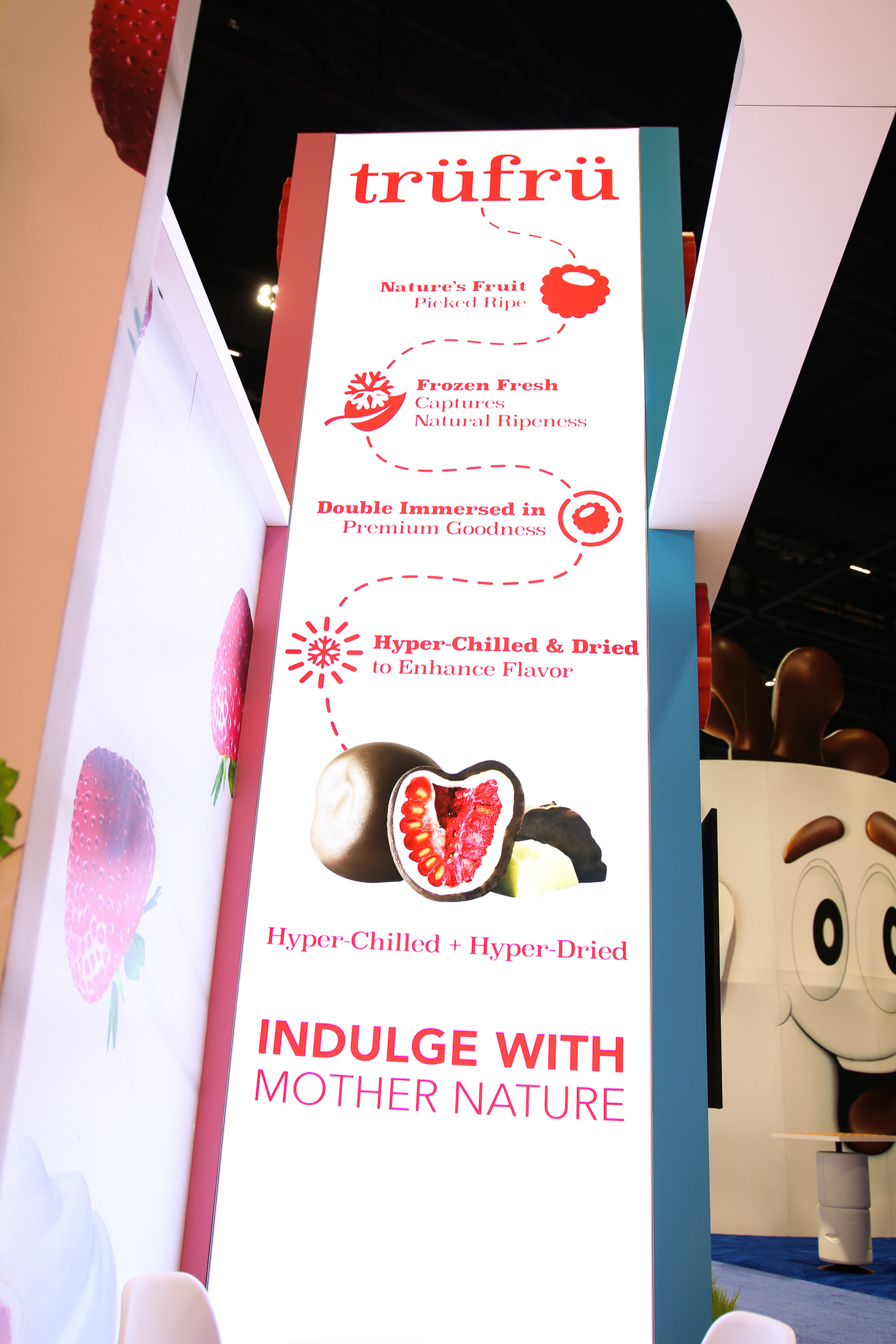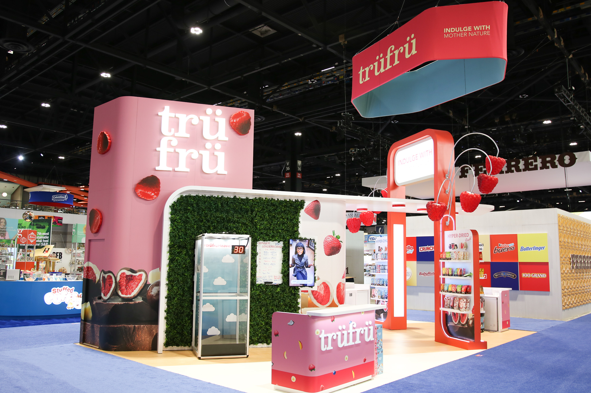 The design for the Tru Fru 20×30 booth was centered around the client’s request for a “fun and whimsical” atmosphere. To achieve this and reinforce the brand’s identity, we integrated 3D-printed lighted raspberries into the space to add a playful element. Additionally, we positioned the booth at an angle to maximize the available space and optimize traffic flow, ensuring attendees can easily move through the area to sample the product.