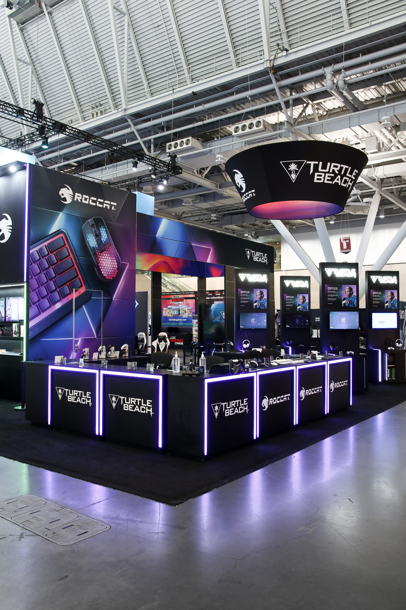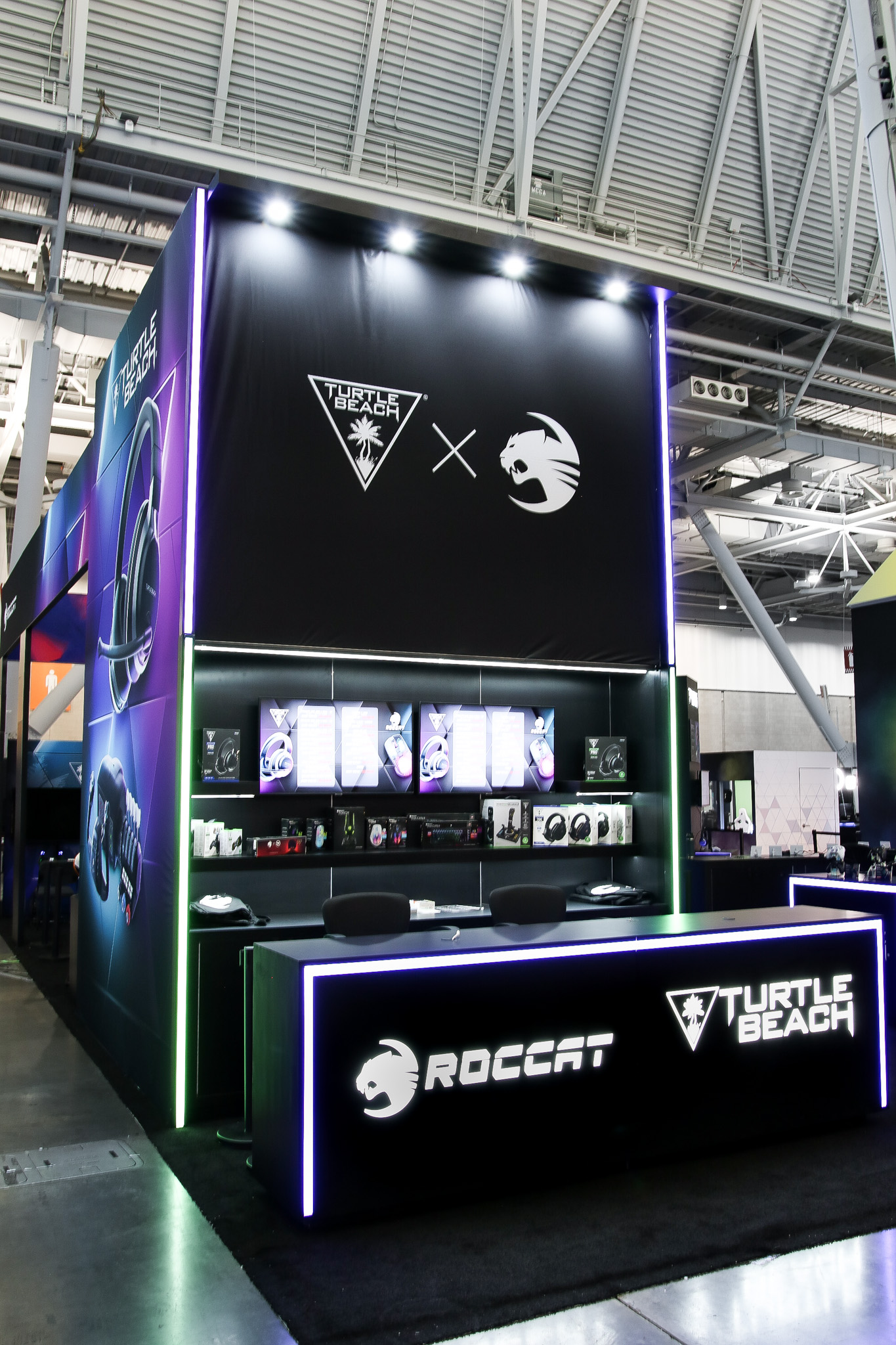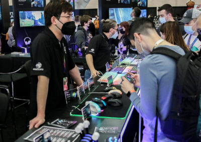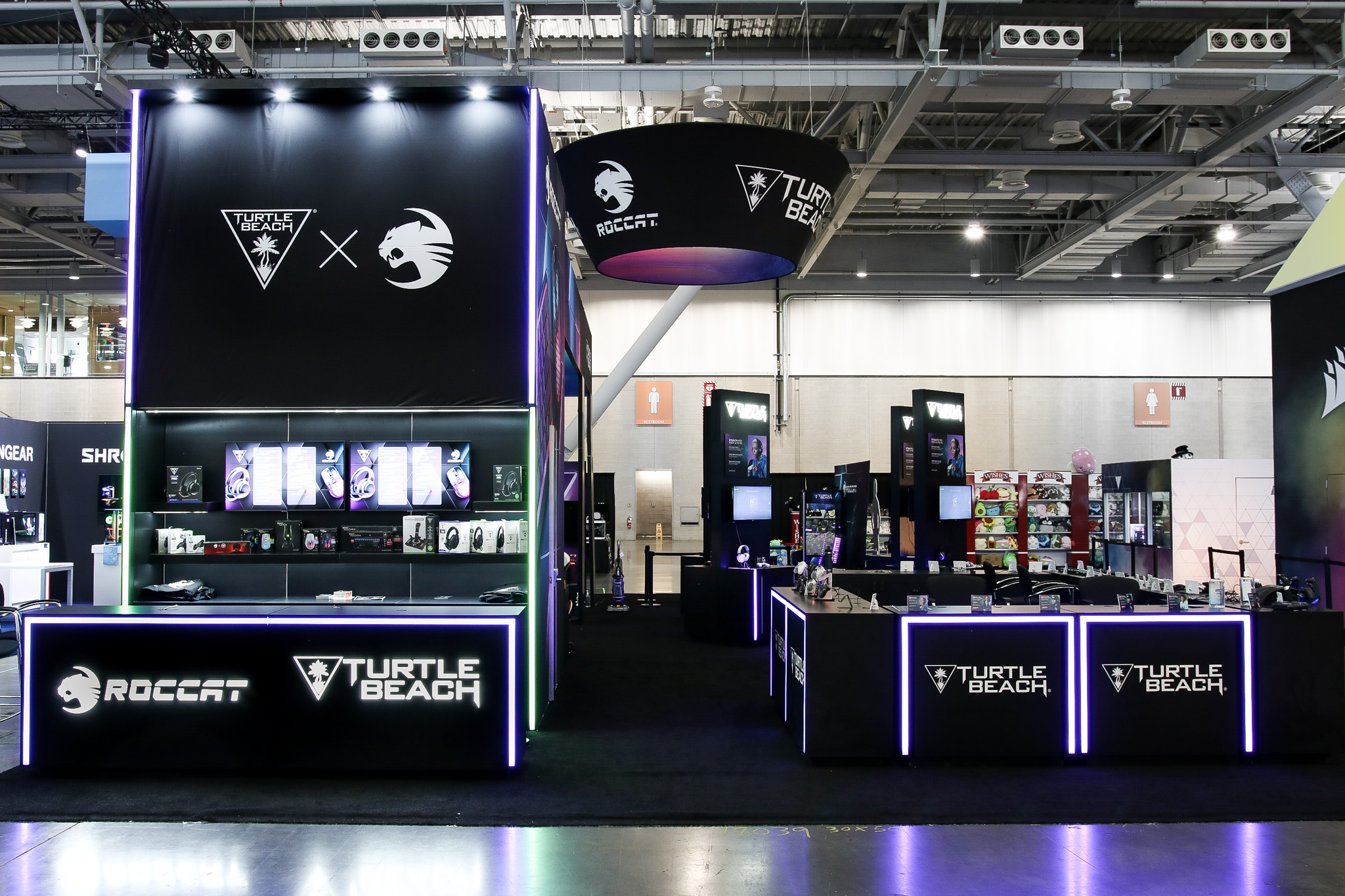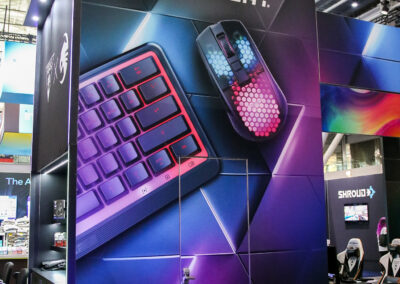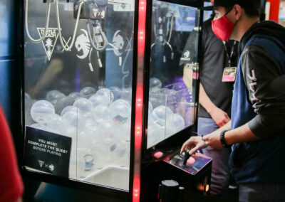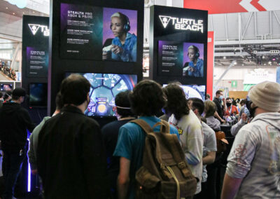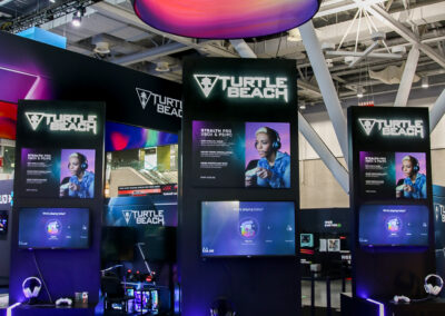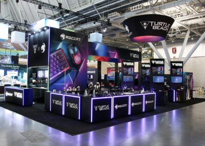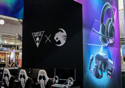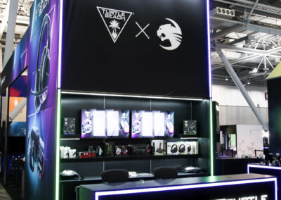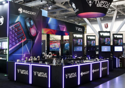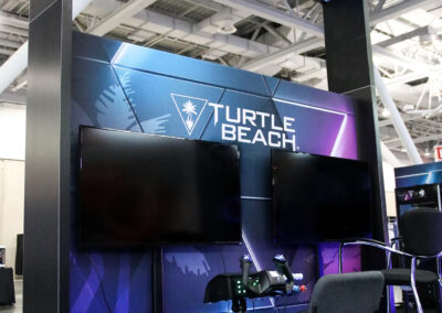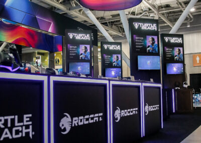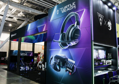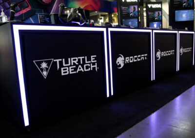 This 30×50 booth at PAX Expo was designed and built with gaming as the main intent. RGB lit counters and gaming stations were created to bring a buzz to this Turtle Beach booth. We added pierce cut back lit logos to the tall gaming kiosks so you knew exactly what booth you were at. Bright vibrant graphics brought out the feel of the clients products and the claw machine added an experiential element to the attendees.
