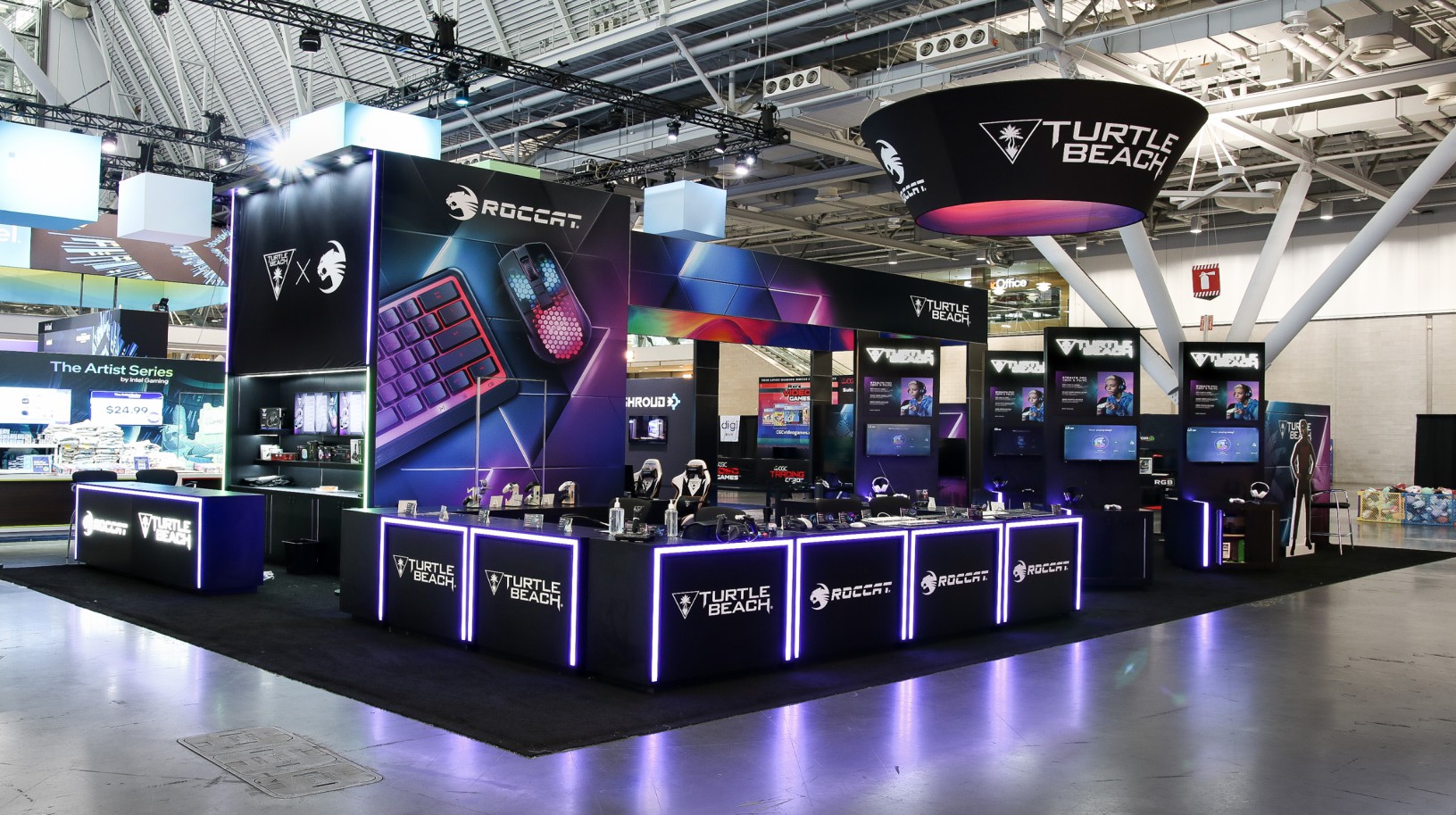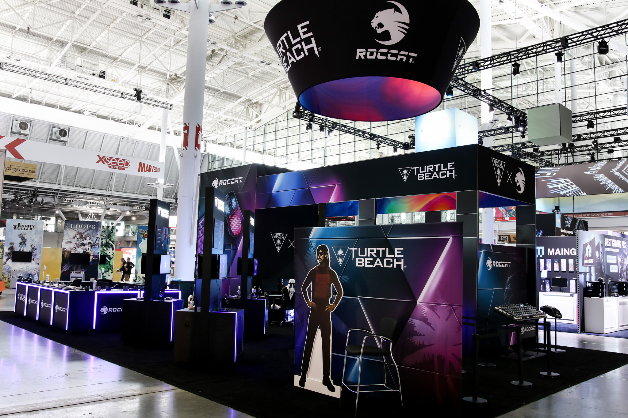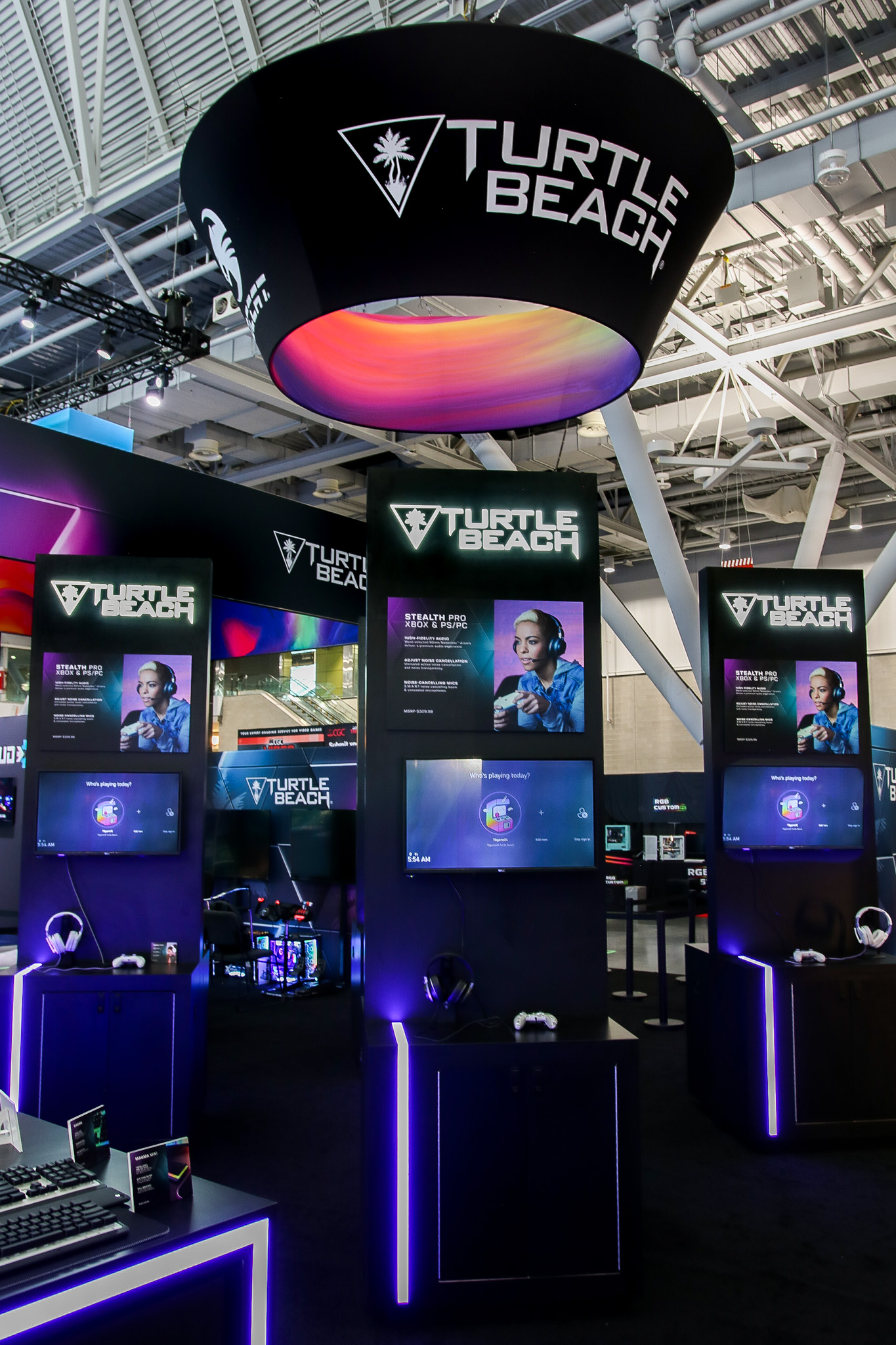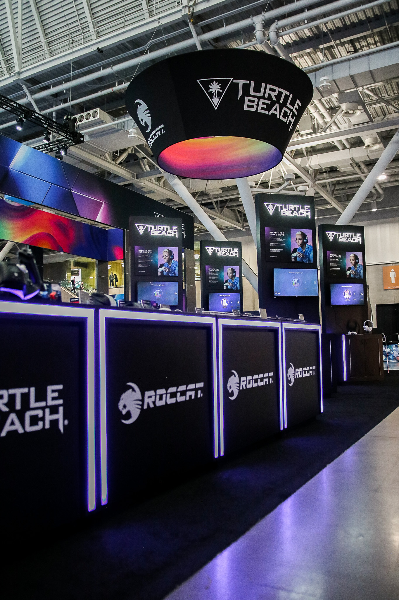This 30×50 booth at PAX Expo was designed and built with gaming as the main intent. RGB lit counters and gaming stations were created to bring a buzz to this Turtle Beach booth. We added pierce cut back lit logos to the tall gaming kiosks so you knew exactly what booth you were at. Bright vibrant graphics brought out the feel of the clients products and the claw machine added an experiential element to the attendees.