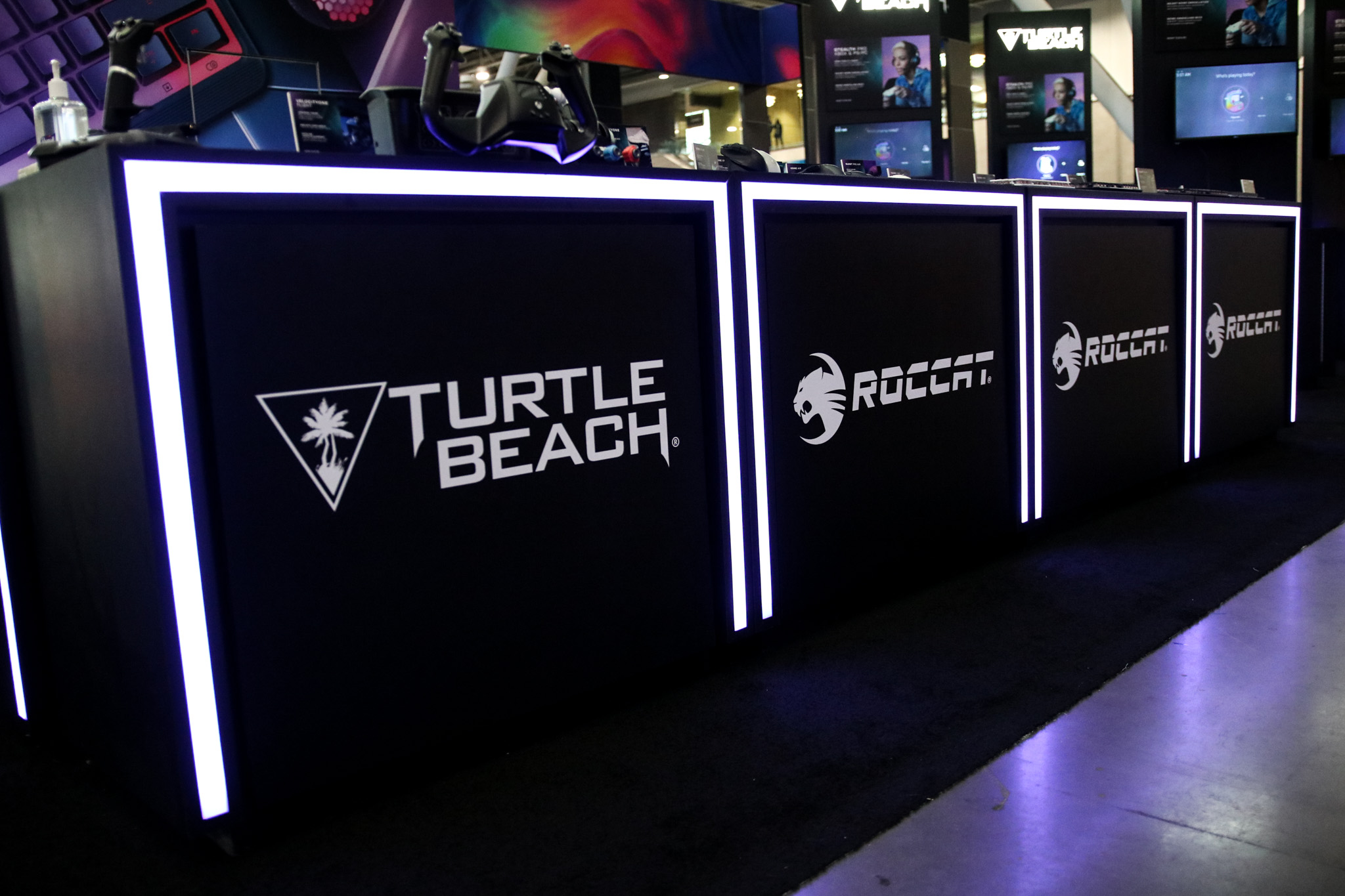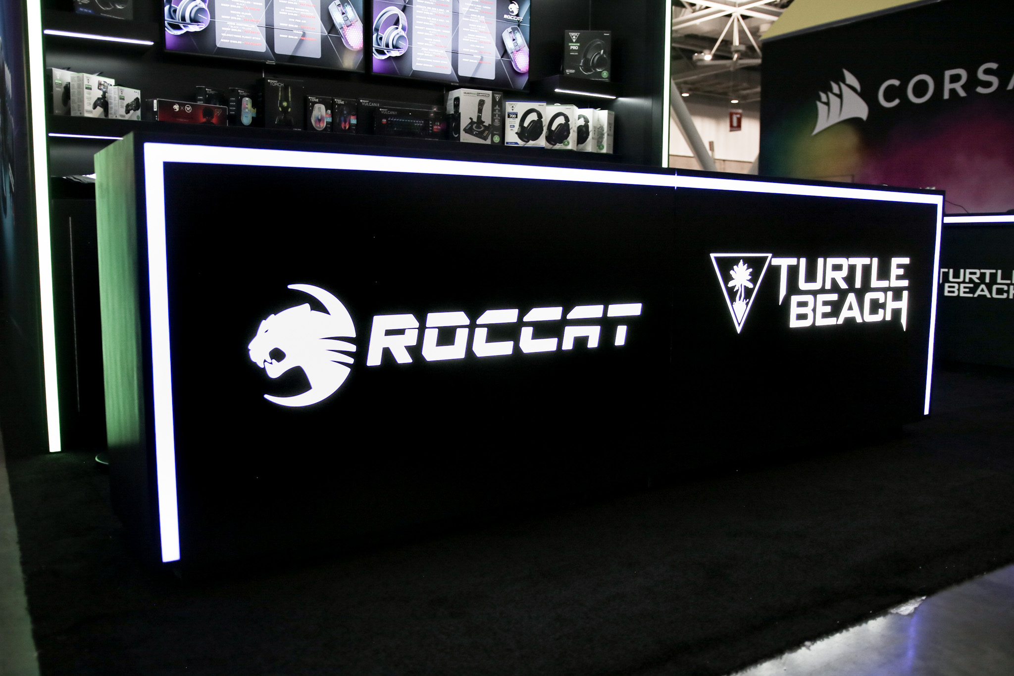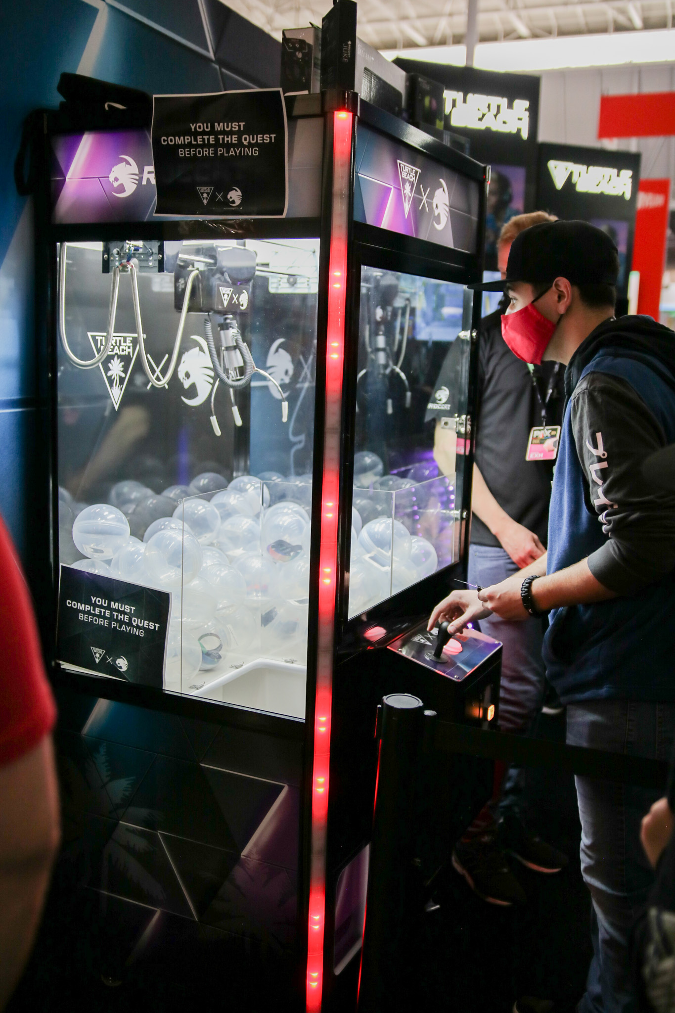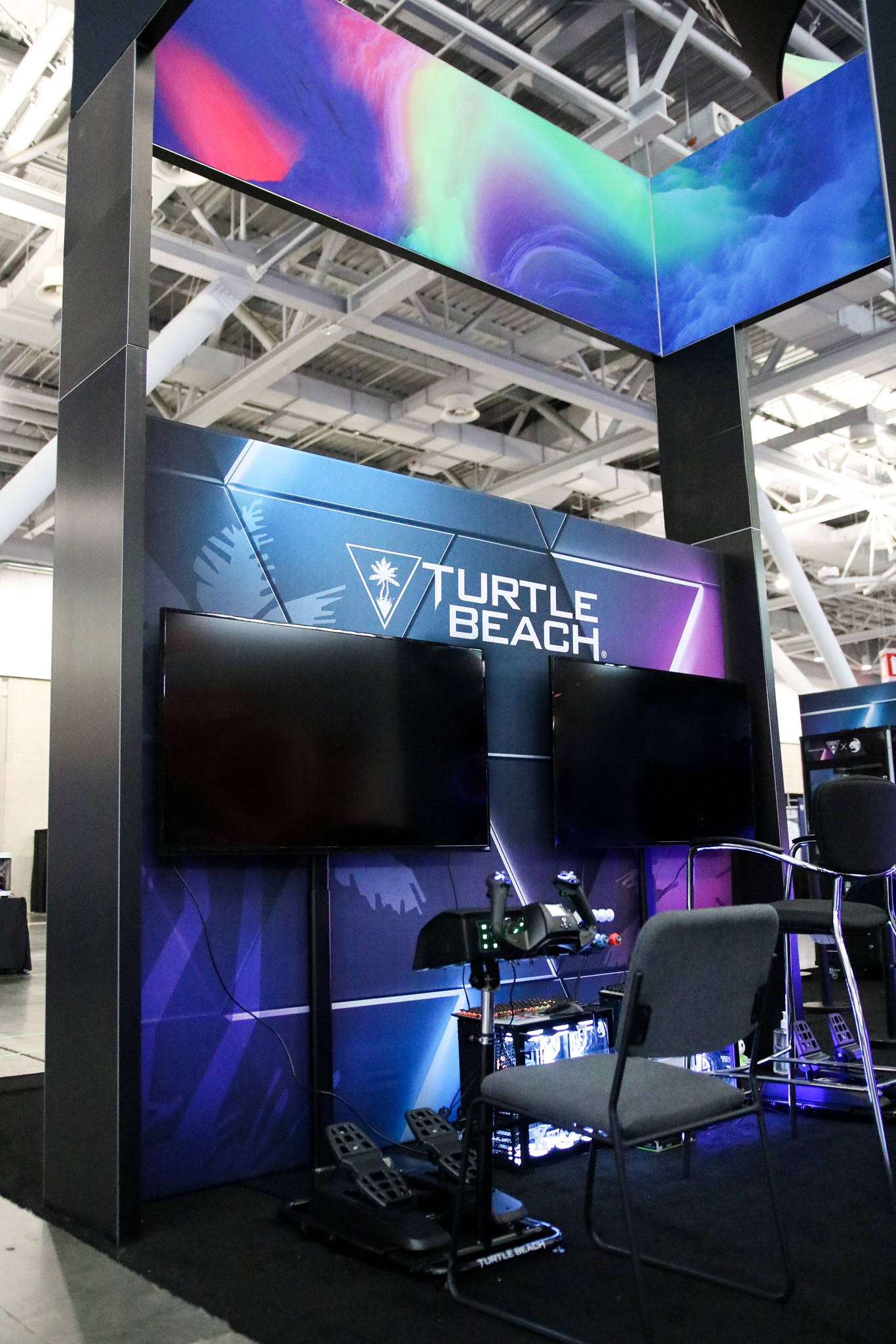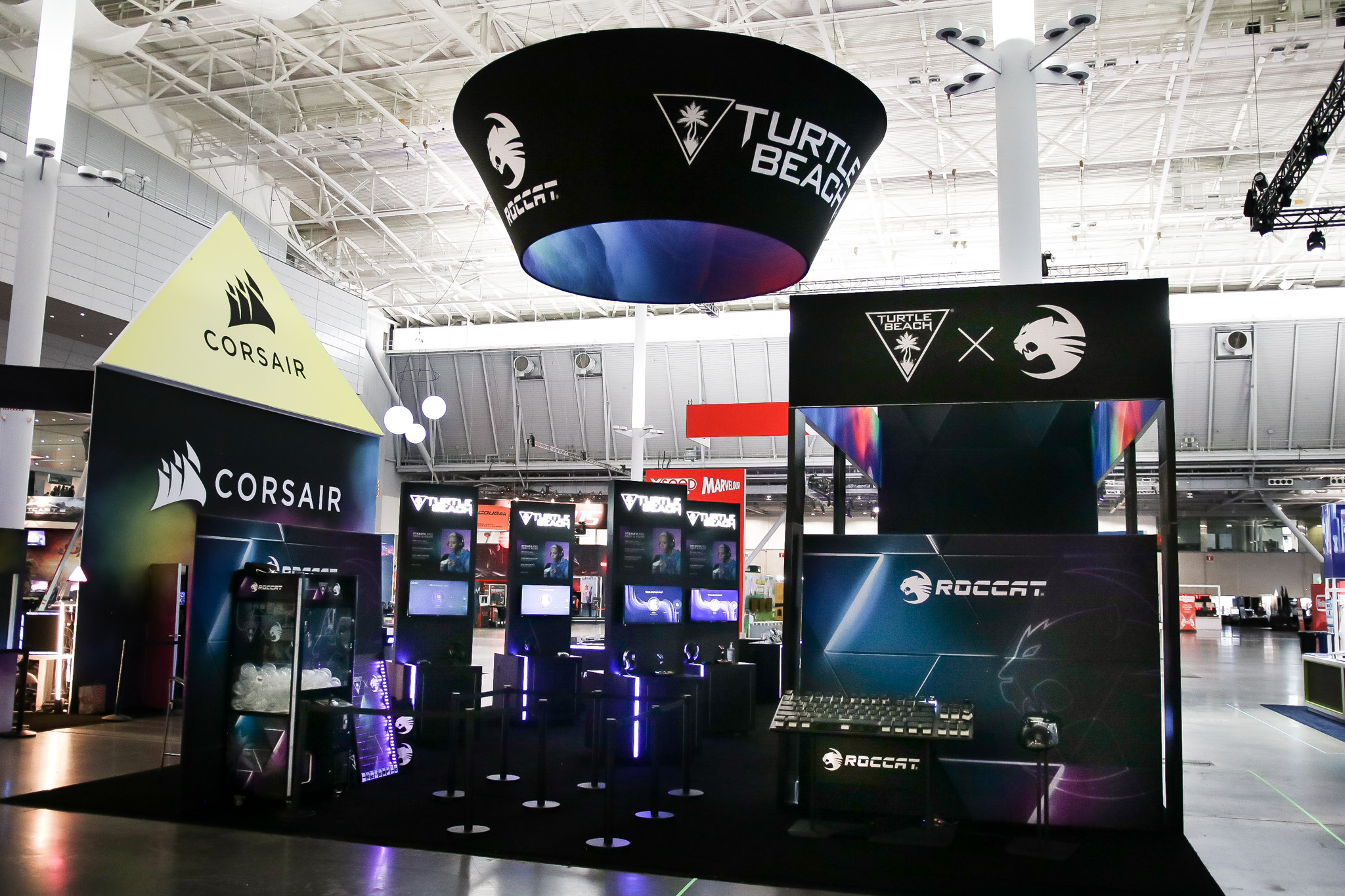 This 30×50 booth at PAX Expo was designed and built with gaming as the main intent. RGB lit counters and gaming stations were created to bring a buzz to this Turtle Beach booth. We added pierce cut back lit logos to the tall gaming kiosks so you knew exactly what booth you were at. Bright vibrant graphics brought out the feel of the clients products and the claw machine added an experiential element to the attendees.