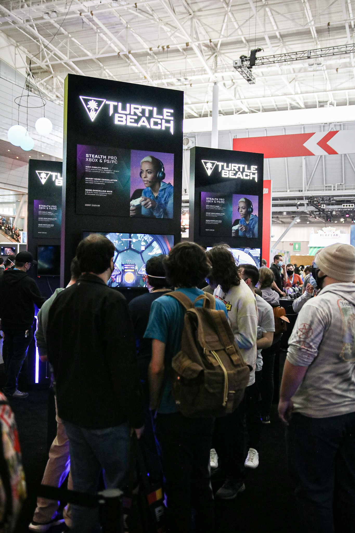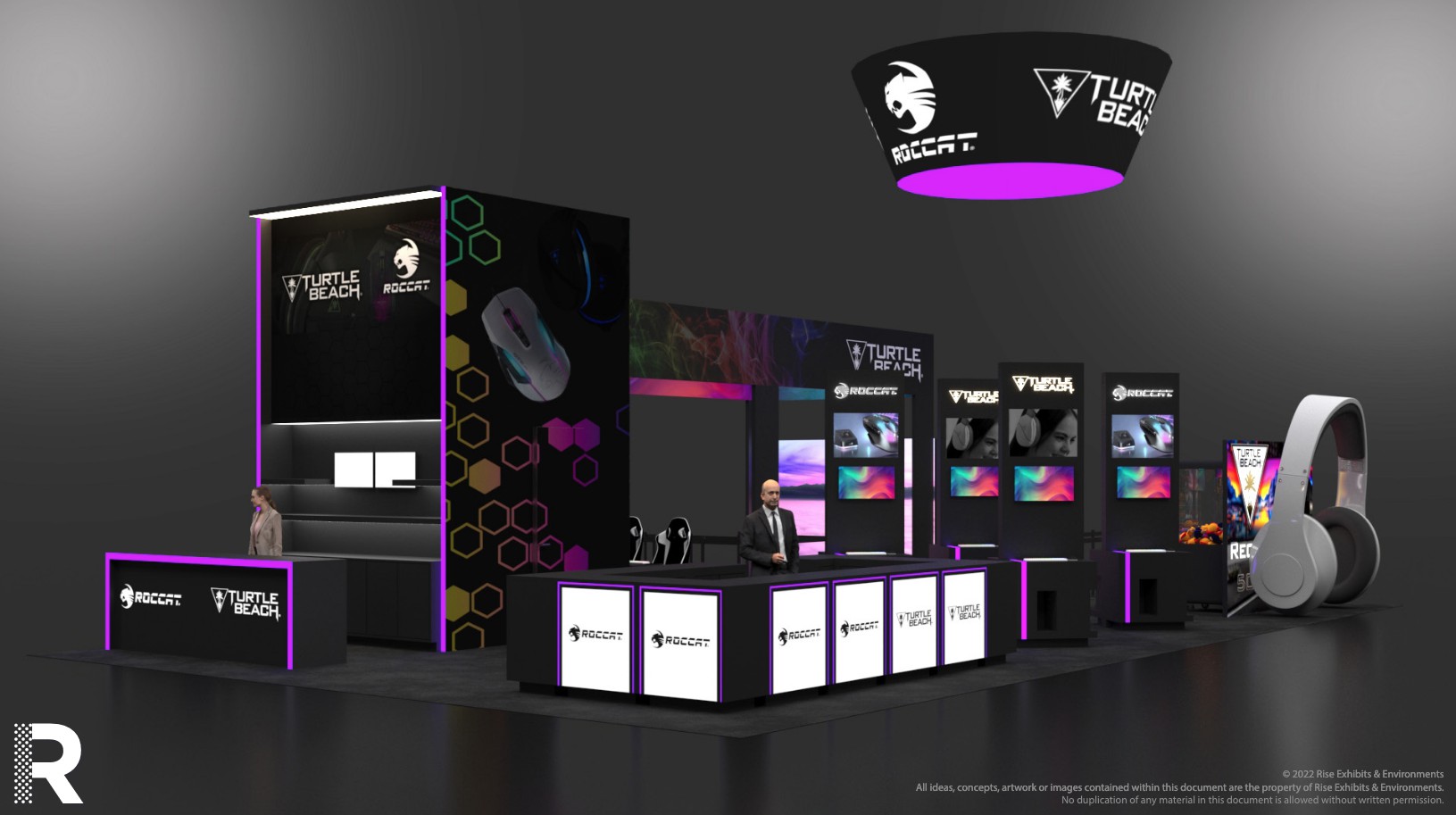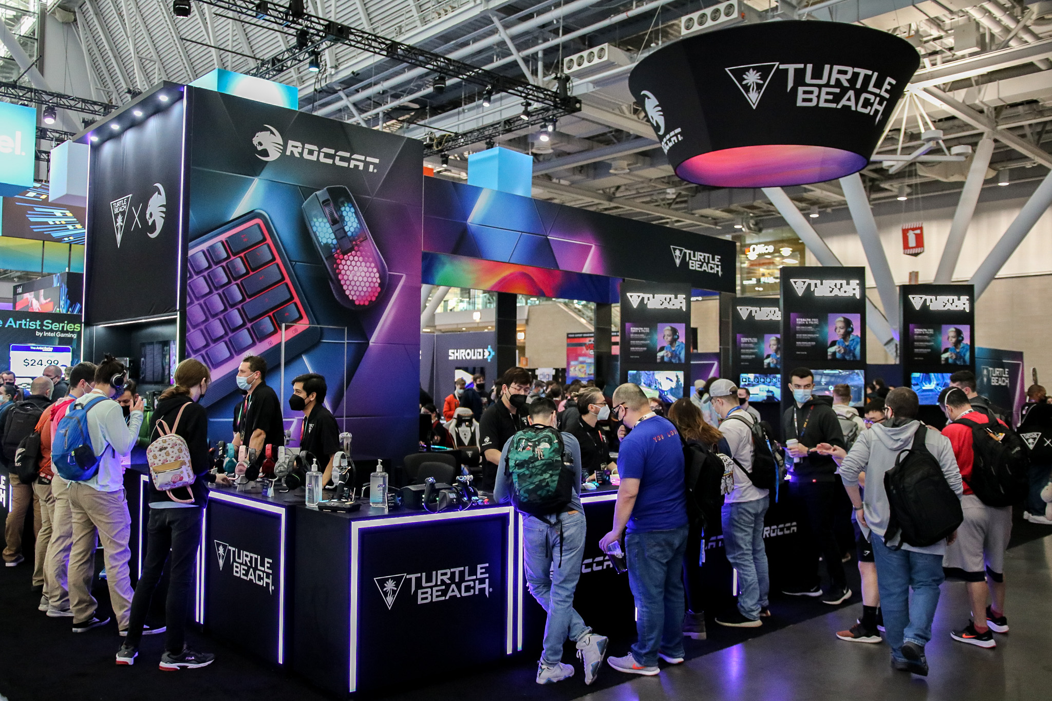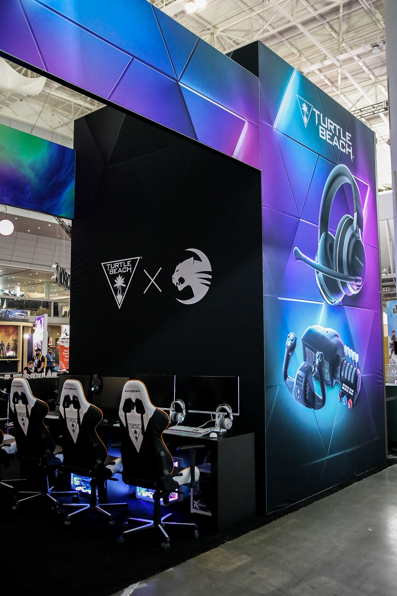 This 30×50 booth at PAX Expo was designed and built with gaming as the main intent. RGB lit counters and gaming stations were created to bring a buzz to this Turtle Beach booth. We added pierce cut back lit logos to the tall gaming kiosks so you knew exactly what booth you were at. Bright vibrant graphics brought out the feel of the clients products and the claw machine added an experiential element to the attendees.